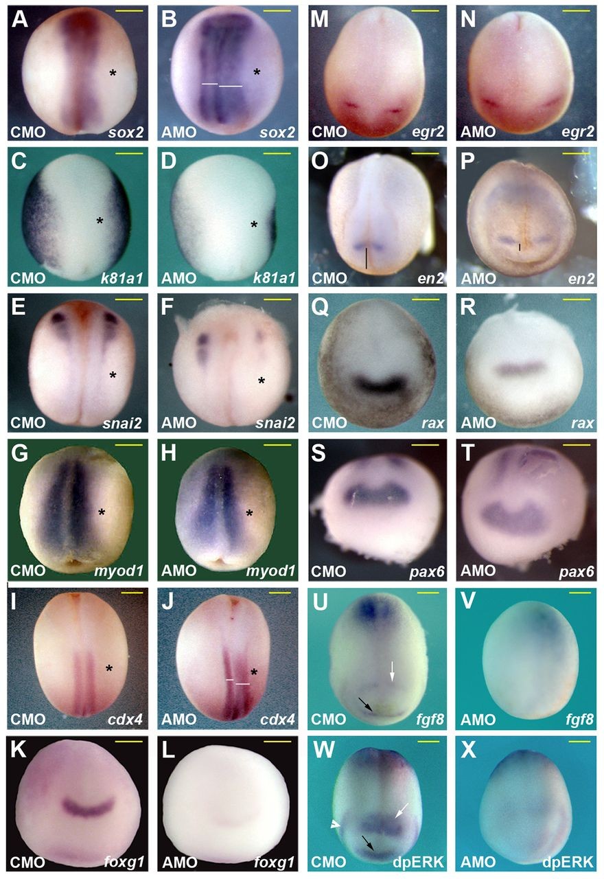 Fig. 5. LPAR6 is required for neural development. Whole-mount in situ hybridisation analysis of MO injected neurulae. (A-J) Dorsal views of neurulae injected with 20 ng of morpholino into a single blastomere at the two-cell stage. Head at the top and injected side (asterisk) on the right. (A,B) Neural plate marker sox2, with increased width on the AMO2-injected side (70%, n=40). (C,D) Epidermal marker k81a1, with decreased expression on the AMO2-injected side (75%, n=40). (E,F) Neural crest marker snai2, with reduced expression on the AMO2-injected side (69%, n=35). (G,H) Skeletal muscle marker myod1, with no defect (100%, n=38). (I,J) Posterior neural plate marker cdx4, with increased width on the AMO2-injected side (80%, n=40). (K-X) Anterodorsal views of neurulae injected with 40 ng of morpholino. (K,L) Telencephalon marker foxg1, with reduced expression in the AMO2-injected embryo (79%, n=38). (M,N) Hindbrain marker egr2, with normal expression in the AMO2-injected embryo (100%, n=35). (O,P) MHB marker en2, with normal expression in the AMO2-injected embryo (100%, n=35). Expression usually moved anteriorly (74%, n=35). (Q,R) Eyefield marker rax, with reduced expression in the AMO2-injected embryo (70%, n=40). (S,T) Eyefield marker pax6, with reduced expression in the AMO2-injected embryo (60%, n=30). (U,V) Anterior neural plate marker fgf8, with reduced expression in AMO2-injected embryos at the ANR (black arrow) and MHB (white arrow) (100%, n=23). (W,X) Whole-mount immunostaining for dpERK, with reduced ERK activity in AMO2-injected embryos at the ANR (black arrow), MHB (white arrow) and branchial arches (white arrowhead) (92%, n=36). All defects are statistically significant (Fisherâs exact test, P<0.001). Scale bars: 200 μm.