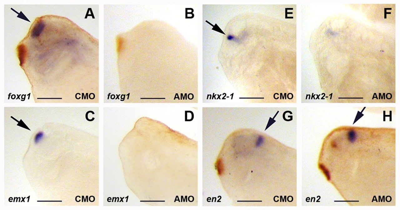 Fig. 6. LPAR6 is required for telencephalic development. Whole-mount in situ hybridisation of tailbud embryos injected with 40 ng of morpholinos; lateral views of the head. (A,B) Telencephalon marker foxg1, with loss of expression in the AMO2-injected embryo (71%, n=35). (C,D) Dorsal telencephalon marker emx1, with loss of expression in the AMO2-injected embryo (75%, n=32). (E,F) Ventral telencephalon marker nkx2-1, with reduced expression in the AMO2-injected embryo (67%, n=33). (G,H) MHB marker en2, with normal expression in the AMO2-injected embryo (100%, n=32). All defects are statistically significant (Fisherâs exact test, P<0.001). Scale bars: 200 μm.