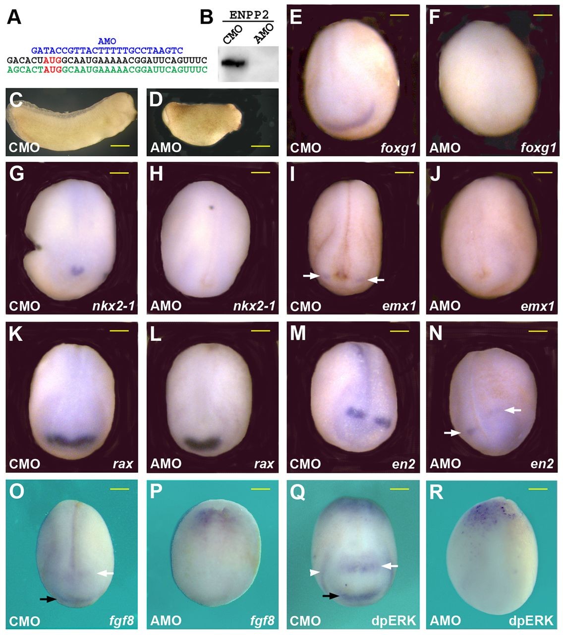 Fig. 9. ENPP2 is required for forebrain development. (A) Sequence of Xenopus enpp2a (black lettering, 5â²-3â²) and enpp2b (green lettering, 5-3â²), translational start site in red, aligned with sequence for AMO (blue letters, 3â²-5â²). (B) Western blot analysis of Xenopus embryos injected with 1 μg of enpp2a.myc mRNA and 40 ng of morpholino. (C,D) Stage 28, lateral views (head to right) injected with 20 ng of either control MO or enpp2-AMO. Anteroposterior axis length of control-morpholino-injected embryos was 4.0 mm (s.d.=0.13, n=45) and that of AMO-injected embryos 2.9 mm (s.d.=0.22, n=45). (E-P) Whole-mount in situ hybridisation analysis of neurulae injected with 20 ng of either control (CMO) or enpp2-AMO. All embryos are viewed from anterodorsal perspective. (E,F) Telencephalon marker foxg1, with reduced expression in AMO-injected embryo (57%, n=82) (G,H) Ventral telencephalon marker nkx2-1, with reduced expression in AMO-injected embryo (59%, n=70). (I,J) Dorsal telencephalon marker emx1, with reduced expression in AMO-injected embryo (72%, n=53). (K,L) Eyefield marker rax, with normal expression in AMO-injected embryo (100%, n=77). (M,N) MHB marker en2, with reduced expression in AMO-injected embryo (16%, n=73 - 6% in controls, n=50). (O,P) Anterior neural plate marker fgf8, with reduced expression in AMO-injected embryo in both ANR (black arrow) and MHB (white arrow) (71%, n=21). (Q,R) Whole-mount immunolocalisation for dpERK. Note reduced ERK activity in AMO-injected embryos in the ANR (black arrow), the MHB (white arrow) and the branchial arches (white arrowhead) (96%, n=26). All defects are statistically significant (Fisherâs exact test, P<0.001) except for en2 (M,N). Scale bars: 600 μm in C,D; 200 μm in E-P.
