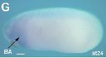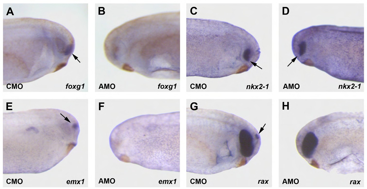 Supplemental Figure 6. Inhibition of enpp2 inhibits telencephalon development. Xenopus laevis embryos were injected at the 2-cell stage with 10 ng per blastomere of enpp2 AMO and incubated until stage 25. Embryos were analysed by whole mount in situ hybridization using DIG labelled antisense RNA probes. A, B) Head of MO injected embryos stained for expression of the telencephalic marker foxg1 (arrow). Note absence of foxg1 expression in ennp2 AMO injected embryo. C, D) Head of MO injected embryos stained for expression of the ventral telencephalic marker nkx2-1 (arrow). Note strong expression of nkx2-1 in ennp2 AMO injected embryo, despite being greatly reduced in neurulae (see figure 9 of main article). E, F) Head of MO injected embryos stained for expression of the dorsal telencephalic marker emx1 (arrow). Note absence of emx1 expression in ennp2 AMO injected embryo. G, H) Head of MO injected embryos stained for expression of the eyefield marker rax. Note small spot of rax expression in the pineal gland (arrow), which is absent from ennp2 AMO injected embryo. The pineal gland is formed by the diencephalon of the newly formed brain.