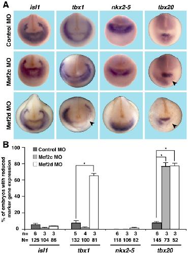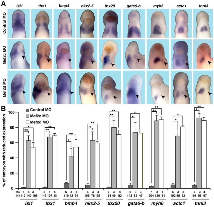 tbx20 expression was down-regulated in Mef2c MO- or Mef2d MO-injected embryos (arrowheads). In addition, Mef2d- but not Mef2c-depleted embryos showed reduced tbx1 expression (arrowhead). Expression of isl1 as well as bmp4 remained unchanged upon loss of Mef2c or Mef2d. Anterior views of embryos are shown. B. Quantitative presentation of observed phenotypes in A is given. N: number of examined embryos; n: number of independent experiments; *, p≤0.05.