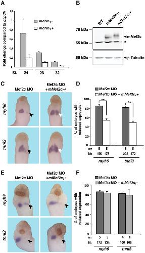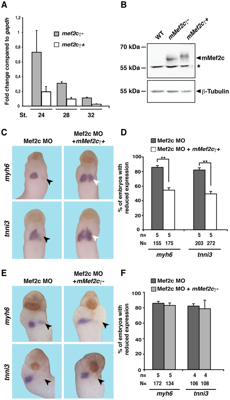 mef2cγ- and mef2cγ+ isoforms are expressed on RNA level in heart tissue enriched explants at stages 24, 28, and 32 as revealed by qPCR. Expression is shown relative to gapdh. B. mMef2cγ- and mMef2cγ+ are expressed on protein level upon RNA injection into Xenopus embryo at comparable levels. β-Tubulin served as loading control. Note that the Mef2c antibody used does not recognize endogenous Xenopus Mef2c protein. The asterisk indicates unspecific background. C–F. Mef2c MO was unilaterally injected together with GFP, mMef2cγ+ or mMef2γ- RNA as indicated. C, E Expression of the cardiac marker genes myh6 and tnni3 was monitored at stage 20 or stage 28. Black arrowheads indicate reduced marker gene expression, white arrowheads highlight the rescued situation. Ventral views of embryos are shown. D, F. Quantitative presentations are shown. N: number of examined embryos; n: number of independent experiments; st: stage; **, p≤0.01.