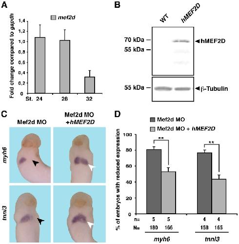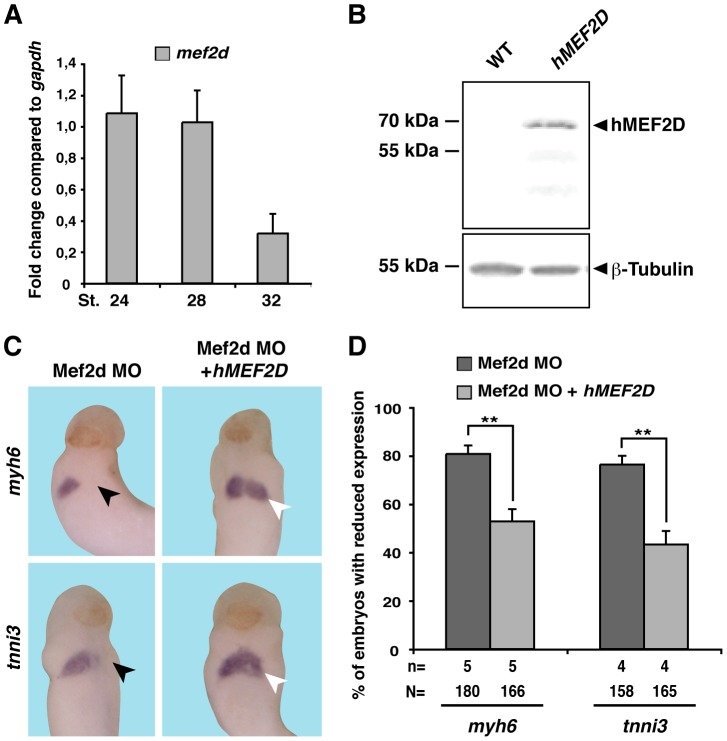 mef2d isexpressed on RNA level in heart tissue enriched explants at stages 24, 28, and 32 as revealed by qPCR. Expression is shown relative to gapdh. B. hMEF2D is expressed on protein level upon RNA injection into Xenopus embryo. β-tubulin served as loading control. Note the Mef2d antibody used does not recognize endogenous Xenopus Mef2d protein. C. Mef2d MO was unilaterally injected together with GFP or hMEF2D as indicated. Expression of cardiac marker genes myh6 and tnni3 was monitored at 28. Black arrowheads indicate reduced marker gene expression, white arrowheads highlight the rescued situation. D. A quantitative presentation of results is given. N: number of examined embryos; n: number of independent experiments; **, p≤0.01.