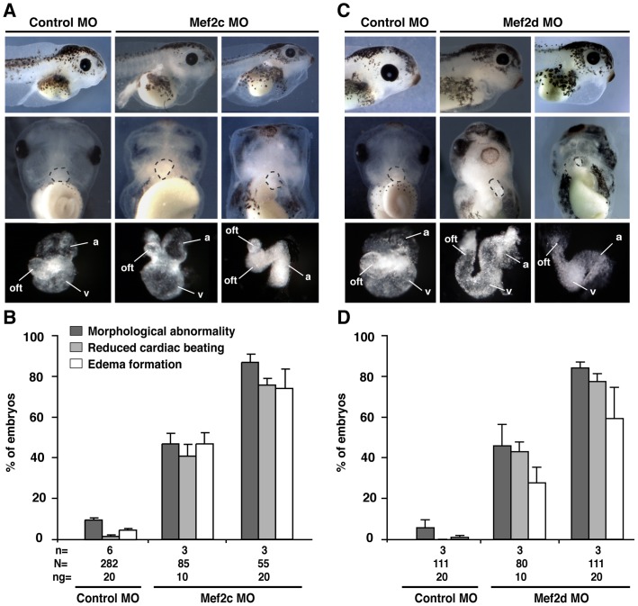 Figure 2. Depletion of either mef2c or mef2d leads to severe cardiac defects.A, C. Mef2c- or Mef2d MO-injected embryos developed cardiac edema and morphological heart defects at stage 42, as compared with Control MO-injected sibling embryos. The amount of MO injected in total (two blastomeres) is given in ng. In addition, cardiac beating was reduced upon Mef2c or Mef2d MO depletion. The dotted dark gray lines indicate the heart. a: atria; v: ventricle; oft: outflow tract. B, D. Quantitative presentations are shown. N: number of examined embryos; n: number of independent experiments.