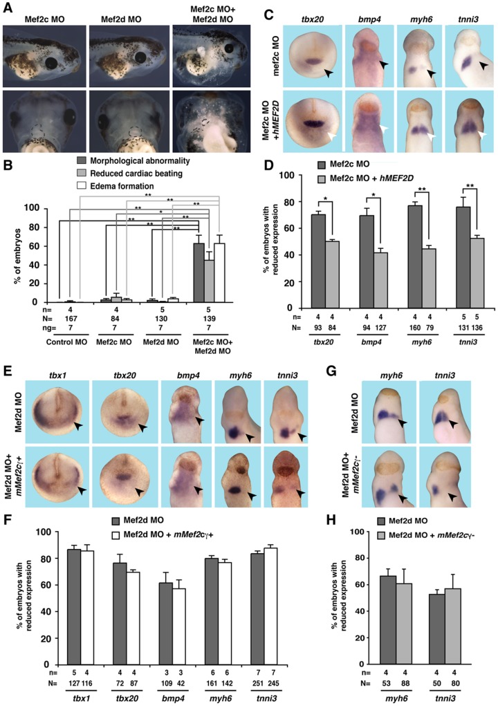 Figure 7. Cooperation of Mef2c and Mef2d in Xenopus.A, B. The injection of 7(in both cases 3.5 ng per blastomere) did not result in cardiac defects. The co-injection of 7 ng Mef2c together with 7 ng Mef2d MO led to a significant increase of the phenotype. The dotted black lines indicate the heart. C, D. Mef2c MO was unilaterally injected along with RNA coding for hMEF2D. Expression of cardiac marker genes was monitored at stages 20 (tbx20, bmp4; anterior views) or stage 28 (myh6, tnni3; ventral views), respectively. E, F. Mef2d MO was unilaterally injected along with mMef2cγ+ RNA. Expression of cardiac marker genes was monitored at stages 20 (tbx1, tbx20; anterior views) or stage 28 (bmp4, myh6, tnni3; ventral views), respectively. G, H. Mef2d MO was unilaterally injected along with mMef2cγ ˜ RNA. Expression of cardiac marker genes was monitored at stage 28 (ventral view). In all cases, black arrowheads indicate reduced marker gene expression, white arrowheads highlight the rescued expression. B, D, F, H. Quantitative presentations of the experiments shown in C, E, G are shown. N: number of examined embryos; n: number of independent experiments; *, p≤0.05; **, p≤0.01.