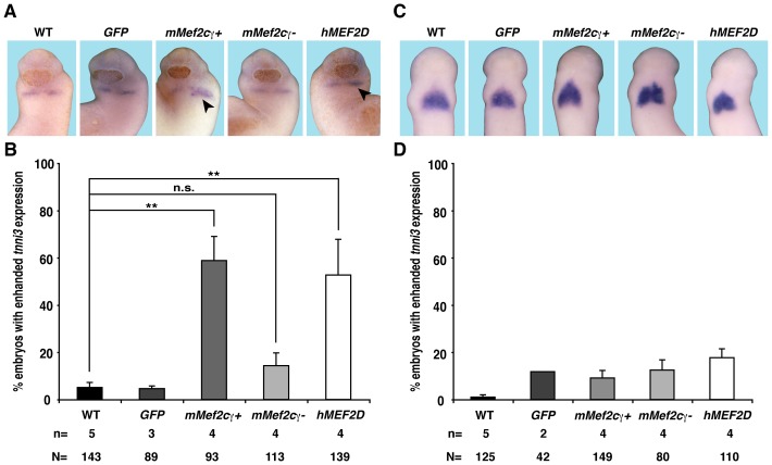 Figure 8. Gain of function analyzes reveals an earlier onset of cardiac differentiation.A, C. RNA coding for mMef2cγ+, mMef2cγ- or hMEF2D was injected unilaterally into the dorsal-vegetal blastomere at eight cell stage and tnni3 expression was monitored at stages 24 (A) or 28 (C). Ventral views of embryos are shown. B, D. The percentage of embryos with enhanced expression of tnni3 on the injected side is given. N: number of examined embryos; n: number of independent experiments; **, p≤0.01.