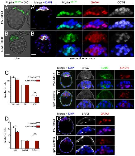 Fig. 5. Inhibition of aPKC prevents the maturation of PrE identity. (A-B′) Late blastocysts, live (A,B) and stained for GATAA4 and OCT4 after culture in 1% DMSO (A′) or 5 μM Gö6983 (B′). GATA4 is present beyond the nuclear borders after treatment with Gö6983. See also supplementary material Movies 7-9. (C) Total, TE and ICM cell numbers. n=17 embryos for 1% DMSO, n=13 for 5 μM Gö6983. (D) Cell numbers for each ICM lineage. n=41 embryos for 1% DMSO, n=36 for 5 μM Gö6983. (E-H) Immunofluorescence for aPKC, DAB2 and GATA4 (E,F) or LRP2 and GATA4 (G,H). Insets show detail of ICMs. Each channel also overlaid with nuclear staining in all panels. ***P<0.001, unpaired Student’s t-test. Bar charts display mean±s.e.m. Scale bars: 20 μm.