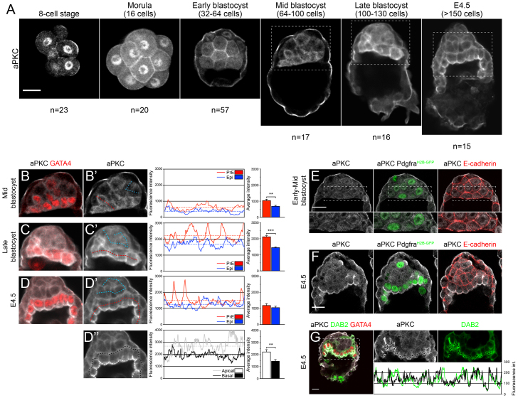 Fig. 1. aPKC is enriched in PrE precursors from the mid blastocyst. (A) Immunofluorescence for aPKC at successive stages of pre-implantation development. (B-D′) Quantification of aPKC levels from mid- to E4.5 blastocysts. Red lines/bars indicate PrE precursors (GATA4+); blue lines/bars indicate epiblast precursors (GATA4-). (D′) Quantification of aPKC levels along apical (grey/white) and basal (black) membranes of the PrE at E4.5. Histograms compare fluorescence intensity between both ROIs on the ICM depicted. Bar charts compare averages from several measurements. Dashed lines on histograms represent averages for profiles shown. (E) Immunofluorescence for aPKC and E-cadherin on an early-mid blastocyst showing aPKC localisation on the membrane/cortex. (F) Immunofluorescence for aPKC and E-cadherin at E4.5. There is a low aPKC staining throughout the ICM, except on the apical membrane of PrE cells. (G) Colocalisation of aPKC and DAB2 at E4.5. Histogram shows overlay of aPKC and DAB2 levels on the pictures above. **P<0.01, ***P<0.001, unpaired Student’s t-test. Bar charts display mean+s.e.m. n, number of embryos. Scale bars: 20 μm.