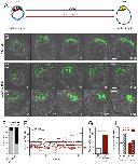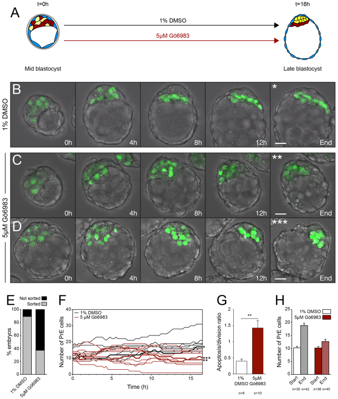 Fig. 4. Inhibition of aPKC in mid blastocysts impairs the segregation of PrE and epiblast. (A) Schematic of PKC inhibitor treatment. (B) Snapshots of a control embryo cultured in 1% DMSO. (C,D) Snapshots of two embryos cultured in 5 μM Gö6983. See supplementary material Movies 4-6, respectively. Green fluorescence indicates H2B-GFP expressed from the Pdgfra locus (PrE precursors). (E) Percentage of sorted embryos: 89% of embryos have a sorted PrE layer after 1% DMSO treatment, 37% of embryos have a sorted PrE layer after 5 μM Gö6983 treatment (P<0.0001, Fisher’s exact test; see Table 1). (F) Time course of PrE expansion. Each line represents one embryo (number of GFP+ cells over time). Bold lines correspond to embryos in B-D as indicated (asterisks). (G) Number of apoptoses per cell division. (H) PrE (GFP+) expansion from the beginning to the end of the culture. **P<0.01, unpaired Student’s t-test. Bar charts display mean+s.e.m. Scale bars: 20 μm.