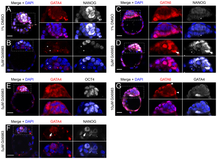 Fig. 6. Inhibition of aPKC prevents the maturation of PrE identity. (A,B) Immunofluorescence for GATA4 and NANOG in representative embryos after culture in 1% DMSO or 5 μM Gö6983. Asterisks indicate double-negative cells, with no staining for either NANOG or GATA4. (C,D) Immunofluorescence for GATA6 and NANOG as in A,B. Arrow indicates a NANOG+, GATA6+ cell on the ICM surface after Gö6983 treatment. (E) Immunofluorescence for GATA4 and OCT4 after treatment with 5 μM Gö6983. GATA4 is excluded from the nuclei present in the cytoplasm throughout the ICM. (F) Immunofluorescence for GATA4 and NANOG after treatment with 5 μM Gö6983. GATA4 is distributed throughout the cell marked with arrows (nucleus and cytoplasm). (G) Immunofluorescence for GATA4 and GATA6 after treatment with 10 μM Gö6983. Arrowheads indicate polar TE cells that retain GATA6 (normally found only in PrE and mural TE at this stage).