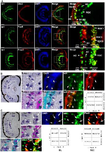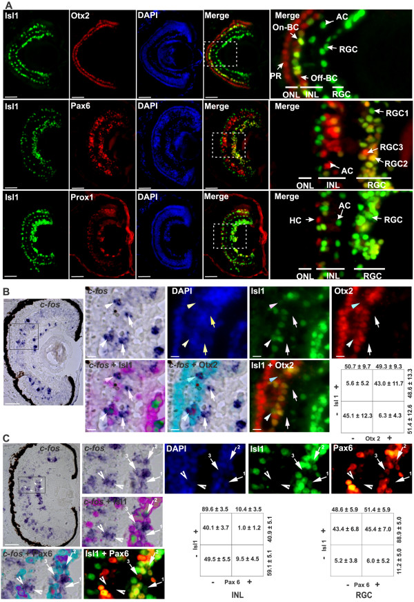 Figure 2. Distinct cell types induce c-fos expression in response to light. (A) Transverse Stage 42 retinal sections co-immunolabeled for Isl1 (green), and either Otx2 (top), Pax6 (middle), or Prox1 (bottom) (red). Higher magnification of a merged picture (right column) and DAPI staining (middle column; blue). The Isl1 antibody recognized On-BCs and ACs in the inner nuclear layer (INL), and RGCs in the RGC layer. Otx2 stained PRs in the outer nuclear layer (ONL) and On-BCs (Otx+/Isl1+) and Off-BCs (Otx+ / Isl1−) cells. Pax6 identified ACs in the INL, and RGCs. Three populations of cells in the RGC layer were defined by Pax6 and Isl1 expression: Isl1+ / Pax6− (RGC1; green), Isl1+ / Pax6+ (RGC2; yellow) and Isl1− / Pax6+ (RGC3; red). Prox1+ HCs were in the outer region of the INL. (B) Light induced c-fos in On-BCs. c-fos mRNA in central retinal sections of dark-reared Stage 42 embryos exposed to light (2500 lux) for 30 minutes, followed by immunohistochemistry against Isl1 (green) or Otx2 (red), and by DAPI staining (blue). A higher magnification of the region is indicated, and the corresponding merges are shown. Two c-fos+ / Otx2+ / Isl1+ (arrowheads) and two c-fos+ / Otx2− / Isl1− (arrows) cells are indicated. The percentage of c-fos + cells in central retinal sections expressing the corresponding markers (mean ± SD; n = 10 retinas) in the INL is shown in tabular form. (C) Two sub-populations of RGCs expressed c-fos. In situ hybridization against c-fos, immunohistochemistry against Isl1 (green) or Pax6 (red), and DAPI staining (blue). Two c-fos+ / Pax6− / Isl1− cells (arrowhead) in the INL, and three c-fos + cells (arrows) corresponding to RGC1 (Isl1+ / Pax6−), RGC2 (Isl1+ / Pax6+), and RGC3 (Isl1− / Pax6+) are indicated. Scale bar = 50 μm for lower, and 10 μm for higher, magnifications.