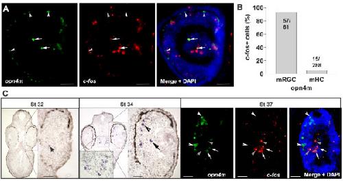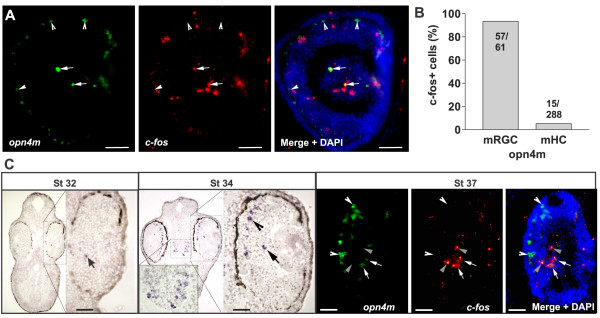 Figure 4. Light induces c-fos expression in melanopsin-expressing retinal ganglion cell (mRGCs) but not melanopsin-expressing horizontal cells (mHCs) as early as Stage 37/38. (A) Double in situ hybridization against opn4m and c-fos on a transverse retinal section from a Stage 42 embryo. Merged image with DAPI staining is also shown. (B) Quantification of the number of c-fos + cells that also express opn4m in the RGC layer (mRGCs) and in the INL (mHCs) expressed as percentages. The number of cells counted is indicated. (C)In situ hybridization against opn4m (Stage 32 and 33/34) (left panels) and double in situ hybridization against opn4m and c-fos (Stage 37/38) (right panels). Left: Transverse sections through the peripheral eye (higher magnification Stage 32 and 33/34) and the brain (Stage 33/34) are shown. mHCs (opn4m+ / c-fos−; arrowhead), mRGCs (opn4m+ / c-fos+; arrow) and RGCs (opn4m− / c-fos+; gray arrowhead) are indicated. Scale bar = 50 μm.