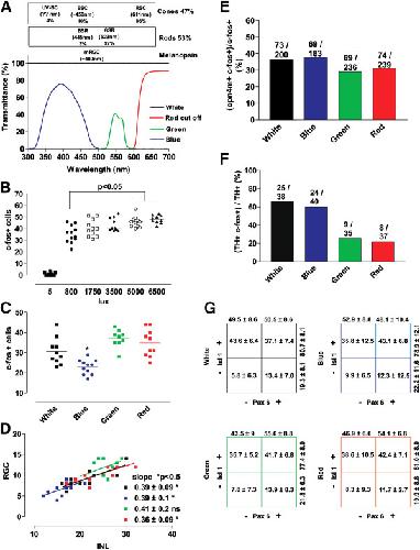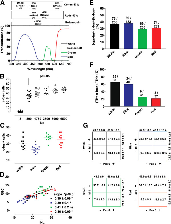 Figure 6. Differential c-fos induction mediated by light colors. (A) Spectrum of transmittance for the blue, green, and red cut-off filters used to determine color dependence of c-fos activation. Also indicated are the different types of photoreceptors and their proportions in the retina of adult Xenopus laevis, as well as the maximum wavelength sensitivity for the corresponding opsins [37]. Ultraviolet (UV)-sensitive cones (UV-SCs), blue-sensitive cones (BSCs), and red-sensitive cones (RSCs) are present, as well as blue-sensitve rods (BSRs) and green-sensitive rods (GSRs). (B, C) Quantification of the number of c-fosâ+âcells in a central retina section of a Stage 42 tadpole exposed to the indicated light intensities (B) or colors (C) for 30 minutes. The horizontal lines indicate the means. Statistics: One-way ANOVA plus Bonferroniâs multiple comparison tests.* Pâ<â0.05. (D) Correlation between the numbers of c-fos-expressing cells in the inner nuclear layer (INL) and retinal ganglion cell (RGC) layer after colored light exposure. Data for each central retina quantified are represented by a dot (nââ¥â10). The slope of the linear regression and the statistical analysis of the coefficient of regression are indicated. (E) Percentage of activated mRGC (opn4mâ+âc-fos+) with respect to the total number of c-fosâ+âresponsive cells in the RGC layer counted in successive sections throughout the whole eye as determined by double in situ hybridization. The average number of c-fosâ+âmRGCs/eye is indicated (nâ=â2). (F) Percentage of THâ+âcells exhibiting c-fos expression after induction with different light colors for 30 minutes. The number of cells counted is indicated. (G) The number of c-fosâ+âcells expressing Pax6 and/or Isl1 in the RGC layer in the central retina (expressed as percentages; meanâ±âSD; nâ=â10) after exposure to different light colors are represented in tabular form.