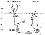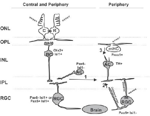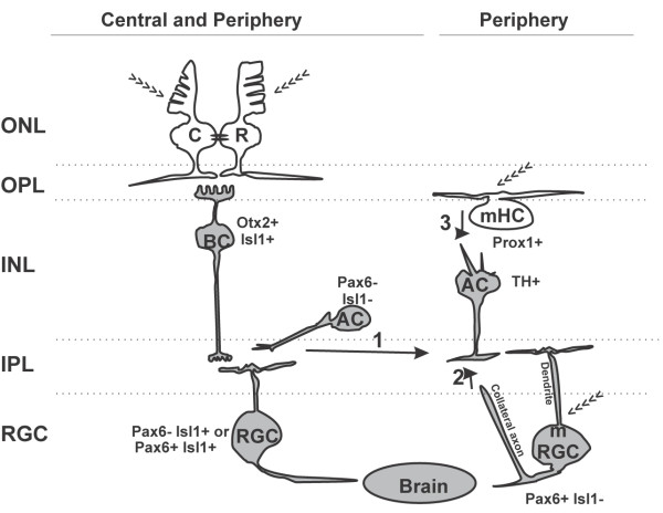 Figure 7. Neuronal circuit diagram of the light input pathway in the tadpole retina. Cells expressing c-fos in response to a first exposure to light are shown in gray, and we propose that they correspond to second-order or third-order neurons. Photosensitive cells (>>>) do not express c-fos as they are first-order neurons. Melanopsin-expressing retinal ganglion cells (mRGCs) induce c-fos in response to light, either by serving as first-order neurons because of their intrinsic photosensitivity, or via a role as a second-order or third-order neuron that receives synaptic inputs from other retinal cells. The classic IF circuit is present in both the central and peripheral retina. In lower vertebrates, rods (R) and cones (C) in the ONL are connected via gap junctions (black ovals) and synapse directly on a single class of On-BCs (Otx2+ / Isl1+), which drive activity in a sub-population of ACs (Pax6â / Isl1â) [59]. Finally, the pathway drives c-fos expression in two equally abundant RGC sub-populations (Pax6â / Isl1+ and Pax6+ / Isl1+). Not illustrated are the cells of the retinal IF circuit that do not express c-fos in response to light: the HCs, Off-BCs, and Pax6+ and/or Isl1+ ACs. The cells involved in non-image-forming (NIF) tasks express melanopsin and are preferentially distributed in the peripheral retina. These include the mHCs (Prox1+),mRGCs (Pax6+ / Isl1â), and dopaminergic (TH+) ACs that turn on c-fos with blue light. Three possible connections may induce c-fos expression in the THâ+âACs: 1) PR-initiated inputs from On-BCs to mRGCs and/or THâ+âACs; 2) synaptic interaction between an mRGC axon collateral with INL cells [62] to provide a retrograde signal from mRGCs to THâ+âACs [63]; and 3) a circuit that may only exist in lower vertebrates, whereby mHCs act as first-order neurons, and interplexiform (TH+) ACs link mHCs to mRGCs.