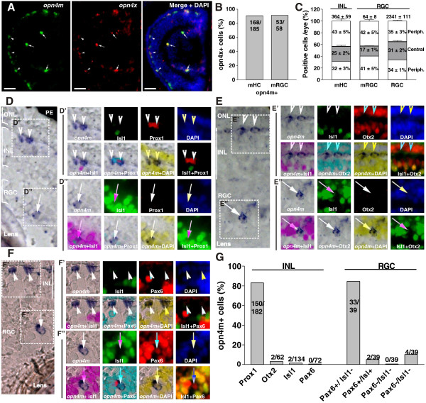 Figure 3. Expression of melanopsin (opn4m and opn4x) in the Xenopus tadpole retina. (A) Double in situ hybridization against opn4m and opn4x in a transverse section of the retina of a Stage 42 tadpole. Merged photograph with DAPI staining is shown (right). Double-positive cells in the outer nuclear layer (ONL) (melanopsin-expressing horizontal cells (mHCs); arrowheads) and in the retinal ganglion cell (RGC) layer (melanopsin-expressing retinal ganglion cells (mRGCs); arrows) are indicated. Scale barâ=â100 μm. (B) Quantification of the number of opn4xâ+âcells that also expressed opn4m, shown as percentage. The number of cells counted is indicated. (C) Distribution of mHCs and mRGCs counted in consecutive sections throughout the whole eye, divided into two peripheral domains and one central domain. The percentage of cells located in each domain, and the total numbers of cells counted (meanâ±âSD; nâ=â3 eyes), are indicated. The total number of RGCs counted (based on DAPIâ+ânuclei), and their distribution, is also shown. (D-F)In situ hybridization identified opn4mâ+âcells in the outer segment of the INL (Dâ²-Fâ², arrowheads) and in the RGC layer (Dâ²-Fâ², arrows). In situ hybridization was followed by immunohistochemistry against Isl1 (green) or Prox1 (red) (Dâ² and Dâ²â²), Isl1 and Otx2 (red) (Eâ² and Eâ²â²), or Isl1 and Pax6 (red) (Fâ² and Fâ²â²). Nuclei stained with DAPI (blue) and merged photograph of the corresponding images are presented. (G) The percentage of cells double-labeled for opn4m and the indicated marker in the INL and the RGC layer, as well as the number of cells counted, are shown.