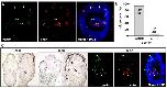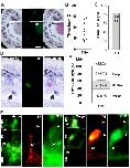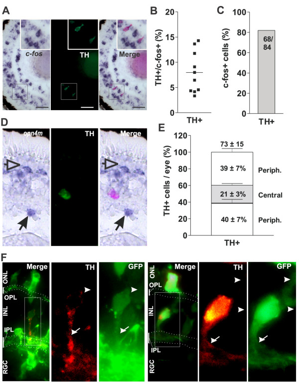 Figure 5. Amacrine tyrosine hydroxylase (TH)-positive cells express c-fos in response to light and localize mainly in the peripheral retina. (A)In situ hybridization against c-fos of a central retinal section from a Stage 42 tadpole exposed to light (2500 lux, 30 minutes) followed by immunohistochemistry against TH. Insets show higher magnification of a c-fos+ / THâ+âcell. (B) Percentage of THâ+âcells relative to the total number of c-fosâ+âcells in each central retinal section is indicated by a dot; the horizontal line represents the mean (nâ=â10). (C) Percentage of THâ+âcells exhibiting c-fos induction by light. The number of cells counted is indicated. (D) Transverse section of the eye from a Stage 42 tadpole showing a representative in situ hybridization label for opn4m and immunohistochemistry results for TH. Merge image is shown in the right panel. mHC (arrowheads) and mRGC (arrows) are indicated. (E) Distribution of THâ+âcells counted in consecutive sections throughout the whole eye, divided into two peripheral areas and one central area. The percentage of the cells located in each region and the total numbers of cells counted (meanâ±âSD; nâ=â3 eyes) are indicated. (F) Morphology of the THâ+âcells. Stage 28 embryos were electroporated with a GFP construct. At Stage 42, Double-positive cells (THâ+âand GFP+) were revealed by immunohistochemistry. Examples of two cells are shown, with the merged image shown on the left, and the higher magnification of the THâ+â(red) and GFP (green) cells shown in the right panels. Neurite extensions (TH+ / GFP+; arrow) oriented to the inner plexiform layer (IPL), and neurites (THâ / GFP+; arrowhead) oriented to the outer plexiform layer (OPL), are indicated. The IPL and OPL are shown by dots. INL, inner nuclear layer; ONL, outer nuclear layer; RGC, retinal ganglion cell layer.