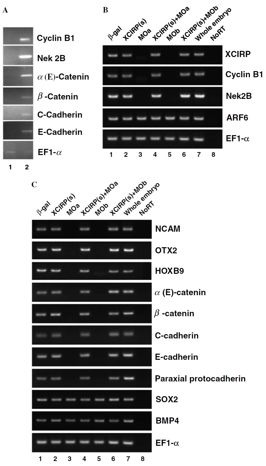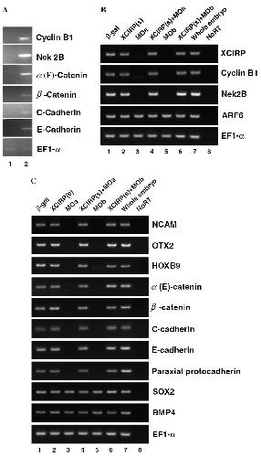 were developed to stage 22. The expression of XCIRP, cyclin B1, Nek2B, ARF6, EF1a, NCAM, SOX2, BMP4, aE- and b-catenin, C- and E-cadherin, as