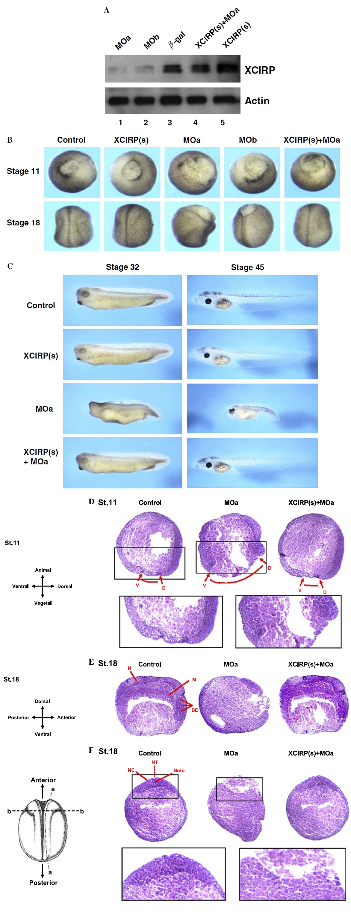 b-gal; lane 4, sXCIRP +MOa; and lane 5, sXCIRP. (B,C) Embryos were allowed to develope to stages 11, 18, 32, and 45, as indicated. (DâF) Histological