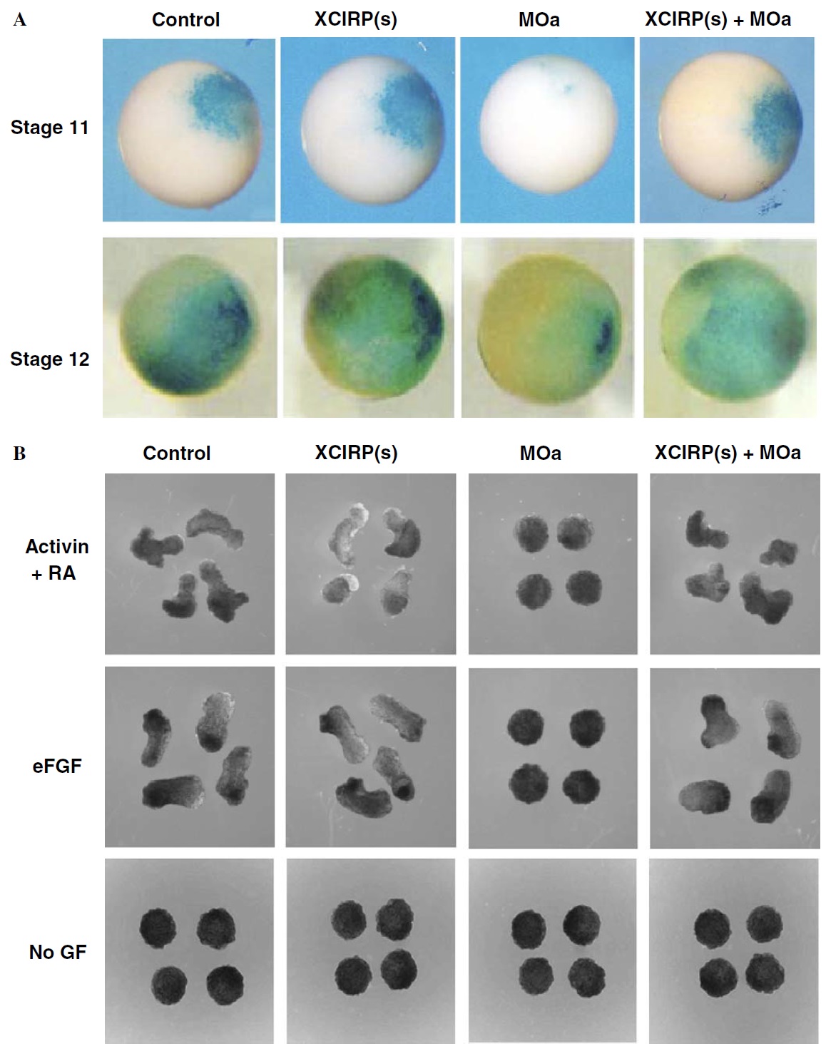combination of XCIRP(s) +MOa as indicated. The embryos were allowed to develop until the control group reached stage 11 and then fixed for X-gal