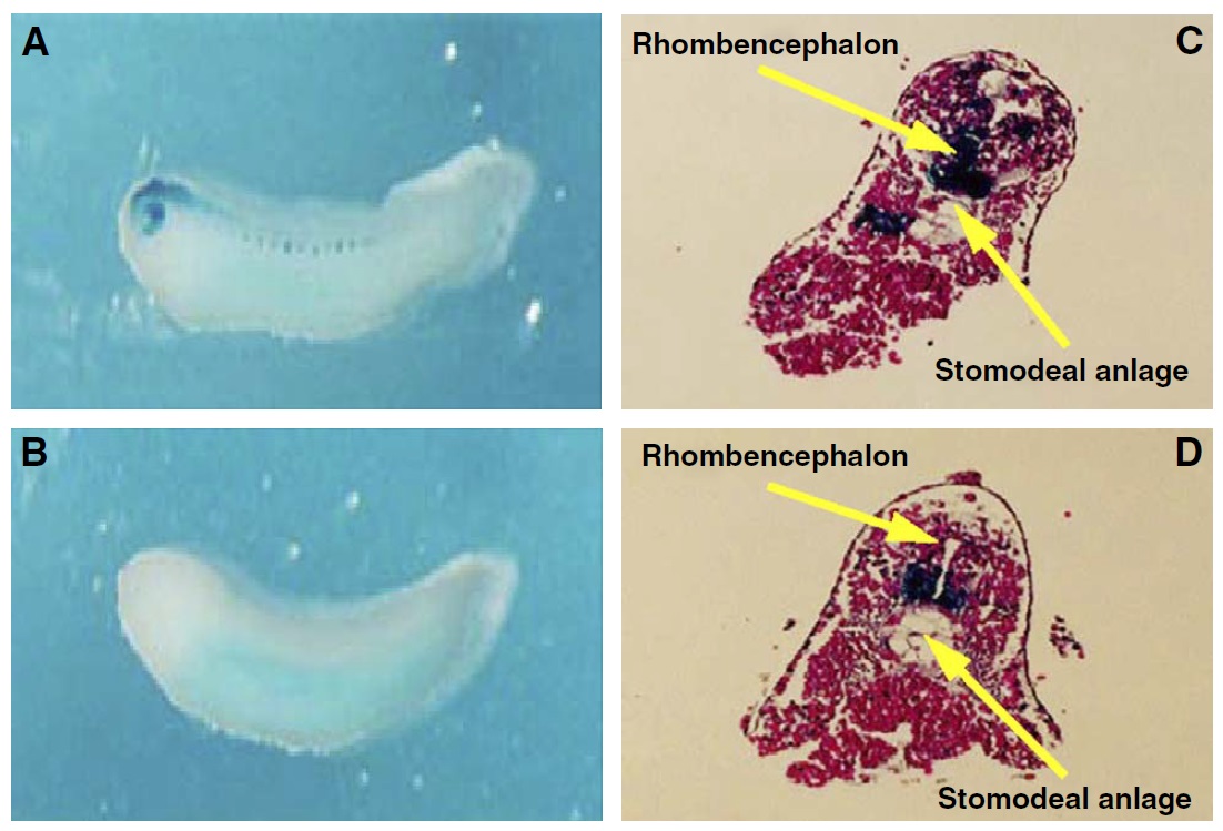 with 5 nM of MOa. The morphogenetic migration pattern of the A1 blastomeres was visualized by X-gal whole-mount staining (A,B) and histological