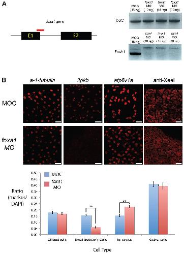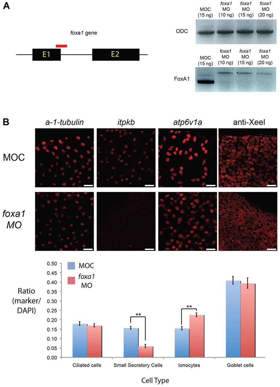 FoxA1 is a regulator of SSC development. (A) The foxa1 gene has two exons and one intron. An antisense morpholino oligo (red) was designed against the splice junction of exon 1 and intron 1. Loss of foxa1 transcript is evident with foxa1 MO compared with controls (MOC) by RT-PCR (using primers either side of the splice site), indicating knockdown of expression. A higher band was evident for the foxa1 morphants, which is indicative of an unspliced transcript. There is no difference in the intensity of bands for the ubiquitously expressed gene ornithine decarboxylase (ODC). (B) Representative images of stage 32 embryos showing the frequency of each cell type after applying MOC or foxa1 morpholino. Ciliated cells were marked by α-1-tubulin, SSCs by itpkb, ionocytes by atp6v1a and goblet cells by antibody to Xeel. The total number of cells in a defined area was determined by DAPI staining of nuclei and a ratio for each marker relative to the total number of cells was determined as shown in the chart. The mean ratio for ten embryos is shown for each sample. Error bars represent s.e.m. Student�s t-test, P<0.01 (**). Scale bars: 50 μm.