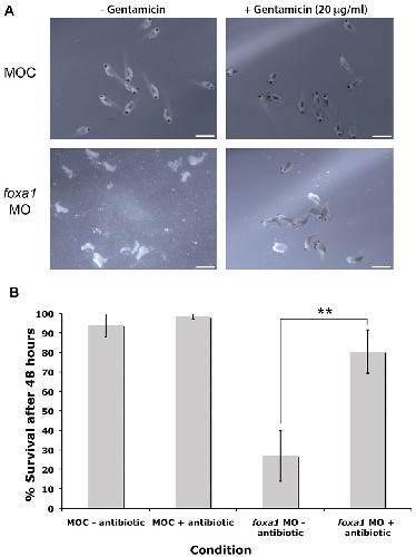 Depletion of SSCs leaves embryos susceptible to infection. (A) Representative images showing embryo death following foxa1 knockdown. Supplementing the media with the broad-spectrum antibiotic, gentamicin (20 μg/ml) leads to a greater level of survival. n=7 experiments. (B) Quantitation of the survival rate. Error bars represent s.e.m. Student�s t-test, **P<0.01. Scale bars: 2 mm.