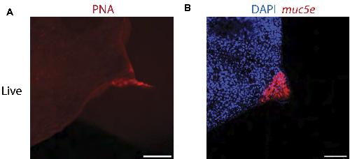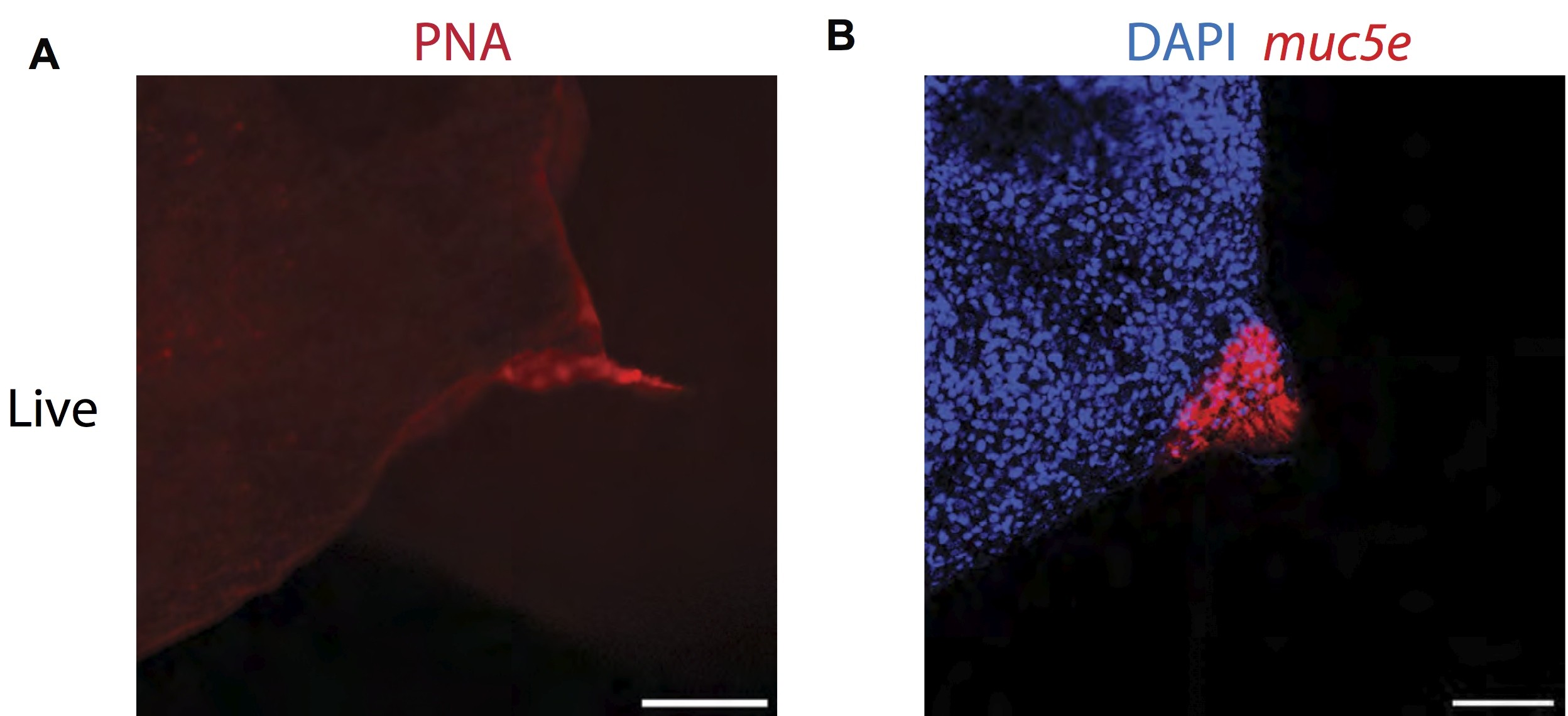 Fig. S3. Muc5e, a cement gland specific Mucin. (A) Addition of PNA-Alexa Fluor-568 to live embryos at stage 32 shows strong staining of the mucus-like material that emanates from the cement gland. (B) Fluorescent in situ hybridization for muc5e (red) and DAPI (blue) staining of nuclei shows exclusive expression of muc5e in the cement gland. Scale bars: 200 μm (A) and 100 μm (B).
