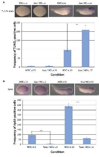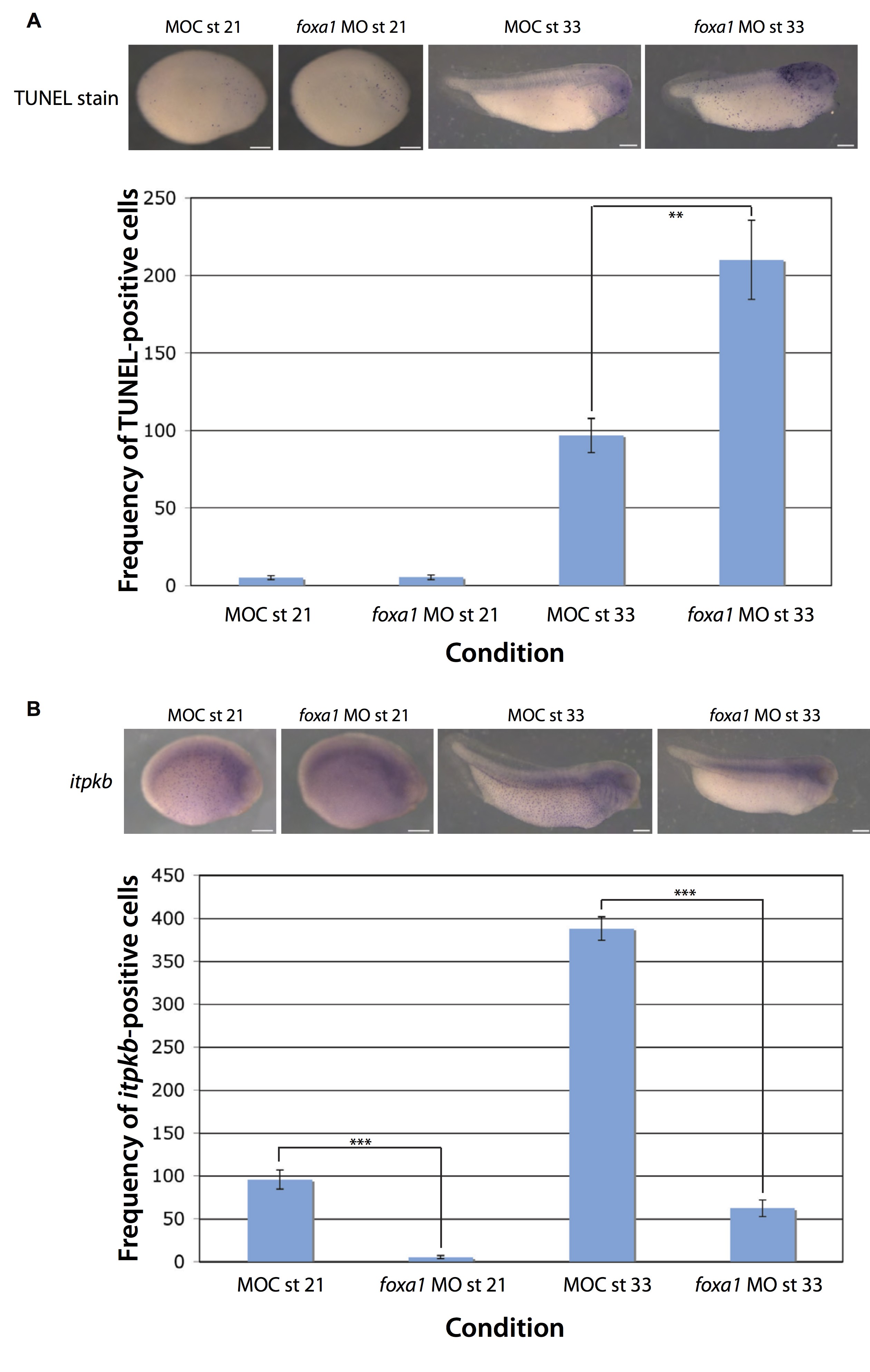 Fig. S4. Analysis of cell death in the epidermis of foxa1morphants. (A) TUNEL stains of epidermis in controls and foxa1 morphants at stage 21 and stage 33. The frequency of cells in a defined area on the flank epidermis was counted and the means determined as shown in the chart. n=11 embryos (MOC st. 21), n=9 embryos (foxa1 MO st. 21 and MOC st. 33), n=8 embryos (foxa1 MO st. 33). (B) In situ hybridization for itpkb in controls and Foxa1 morphants at stage 21 and stage 33. The frequency of cells in a defined area on the flank epidermis was counted and the means determined as shown in the chart. n=9 embryos (MOC st. 21 and foxa1 MO st. 33), n=10 embryos (foxa1 MO st. 21 and MOC st. 33). Error bars represent s.e.m. Student�s t-test, P<0.01 (**) and P<0.001 (***). Scale bars: 250 μm.