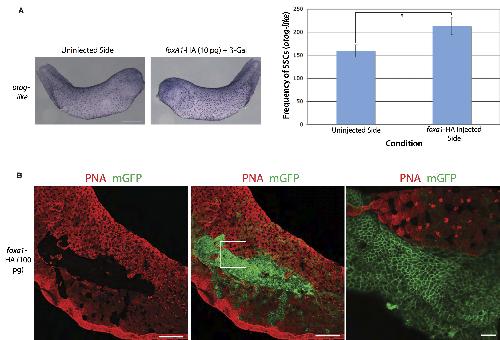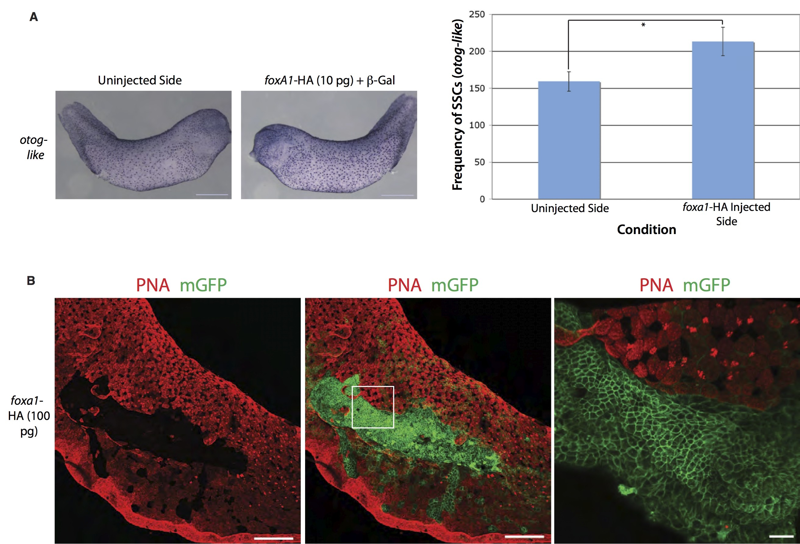 Fig. S5. Foxa1-HA misexpression. (A) Representative images showing misexpression of 10 pg HA-tagged foxa1 mRNA (and lineage tracer β-gal mRNA) in one side of the embryo and probed by in situ hybridization for SSC marker, otog-like, at stage 33. Chart shows comparison of mean number of SSCs in a defined area of the flank epidermis (otog-like positive) on injected and uninjected sides (n=9 embryos). Error bars represent s.e.m. Student�s t-test, P<0.05 (*). Scale bars: 500 μm. (B) Representative image showing embryo