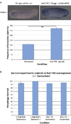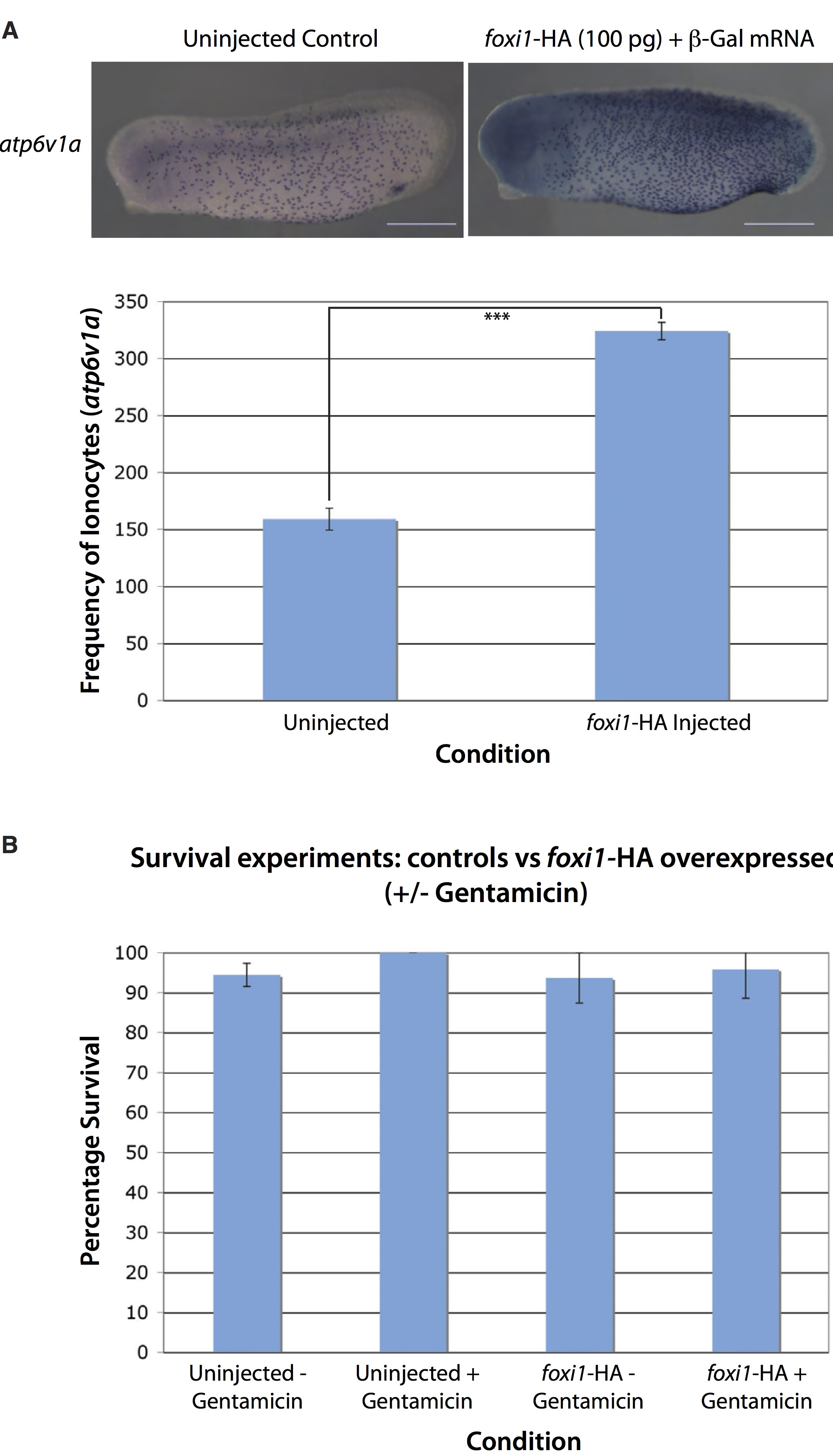 Fig. S6. Foxi1-HA misexpression increases ionocytes but does not affect survival. (A) Representative images of an uninjected control and an embryo injected at the one cell stage with foxi1-HA mRNA (100 pg) and β-gal mRNA. Embryos were fixed at stage 30 and probed for the ionocyte marker gene, atp6v1a. Chart shows comparison of mean number of atp6v1a positive cells in a defined area on the flank epidermis of controls and foxi1-HA overexpressed embryos (n=5 embryos each). (B) Chart showing survival rates of controls and foxi1-HA misexpressed embryos both with and without supplementing with the antibiotic, Gentamicin (10 μg/ml). Results of three independent experiments. Error bars represent s.e.m. Student�s t-test, P<0.001 (***). Scale bars: 500 μm