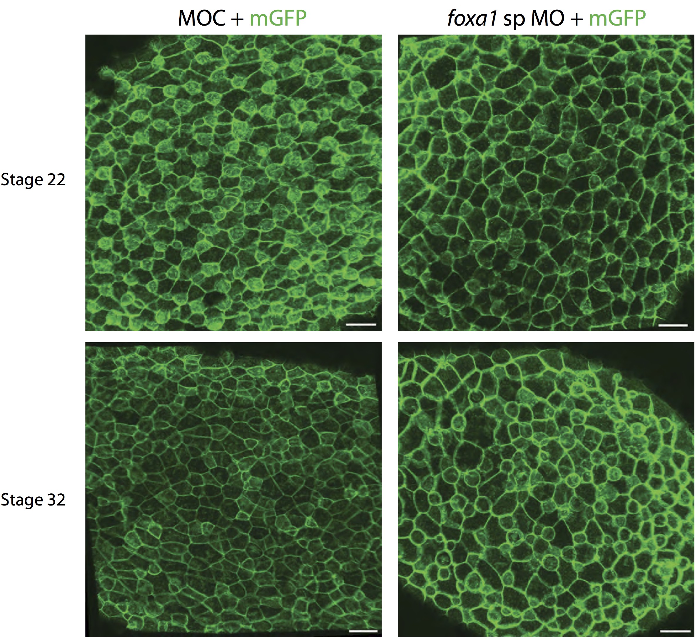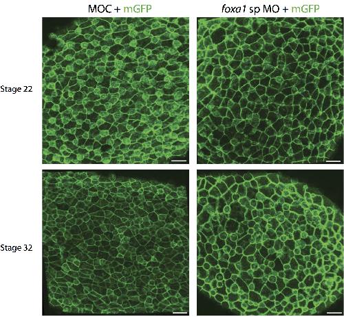 Fig. S7. Impact of foxa1 knockdown on epidermal integrity. Representative images of MOC-treated and foxa1 MO-treated embryos expressing membrane GFP at stage 22 and stage 32. Scale bars: 30 μm