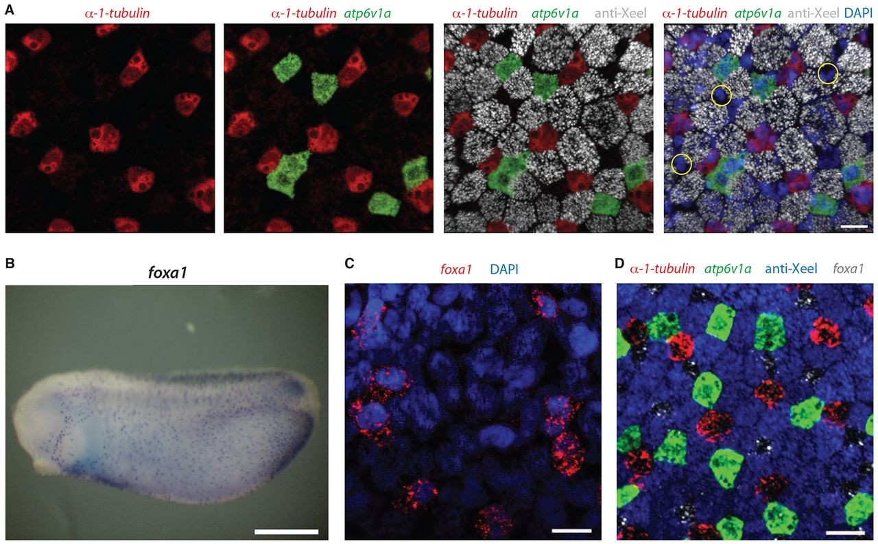 foxa1 marks a new epidermal cell type. (A) Double fluorescence in situ hybridisation and antibody staining for a ciliated cell marker (α-1-tubulin, red), an ionocyte marker (atp6v1a, green) and a goblet cell marker (anti-Xeel, grey) on stage 32 embryos. DAPI (blue) is used to mark each cell. At least one cell type (yellow circles) is not stained by these markers. (B) Chromogenic in situ hybridisation for foxa1 on stage 25 embryos shows scattered, spotted epidermal distribution. (C) foxa1 is epidermally expressed in a subset of DAPI-positive cells. (D) foxa1 expression (grey) completes the epidermal staining when added to markers of the other cell types at stage 32. Scale bars: 20 μm in A,C,D; 500 μm in B.
