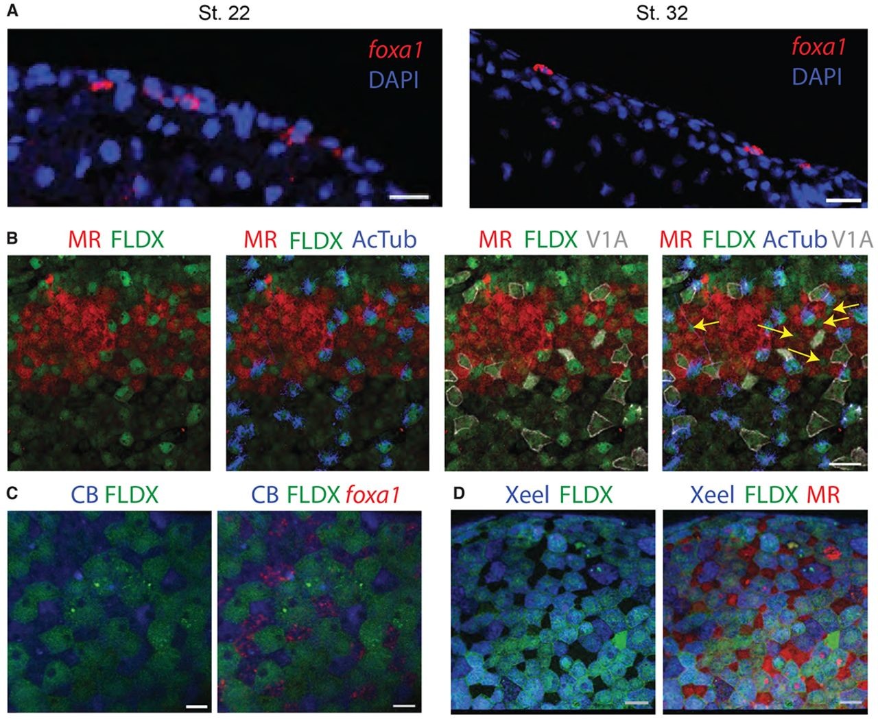 foxa1 cells intercalate from inner to outer layer at mid-tailbud stages. (A) Sections of stage 22 and stage 32 embryos stained for DAPI (blue) and foxa1 (red) by fluorescent in situ hybridisation shows that expression changes from inner to outer layer as the embryo develops. (B) Transplant of MR-labelled (red) outer layer epidermal tissue on to FLDX-labelled (green) host embryo and stained using antibodies for ciliated cell marker, acetylated α-tubulin (AcTub, blue) and ionocyte marker, V1a (grey) at stage 32. A cell type (yellow arrows) intercalates from inner to outer layer in addition to ciliated cells and ionocytes. (C) Transplant of FLDX-labelled (green) outer layer epidermal tissue on to CB-labelled (blue) host embryo and stained by fluorescent in situ hybridisation for foxa1 (red) at stage 32. (D) Transplant of FLDX-labelled (green) outer layer epidermal tissue on to MR-labelled (red) host embryo and stained with anti-Xeel antibody (blue). Scale bars: 50 μm in A,B,D; 15 μm in C.