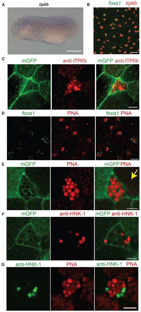 Molecular profile of the new cell type. (A) In situ hybridisation using an antisense probe to the itpkb transcript reveals a scattered, punctate epidermal pattern. (B) Double fluorescence in situ hybridisation for foxa1 and itpkb shows colocalisation of the two transcripts. (C) Antibody staining for Itpkb with mGFP shows localisation in the small cells with large apical vesicles. (D) PNA conjugated to Alexa Fluor-568 colocalises with foxa1. (E) PNA together with mGFP staining shows strong labelling of material in the large vesicles. Staining is also evident at a lower level in vesicles of goblet cells (yellow arrow). (F) Antibody staining to the carbohydrate epitope HNK-1 together with mGFP shows specific expression in the vesicles of the small cells. (G) Co-staining for HNK-1 and PNA shows that they are present in the same cell. Scale bars: 500 μm in A; 50 μm in B; 5 μm in C,E-G; 15 μm in D.