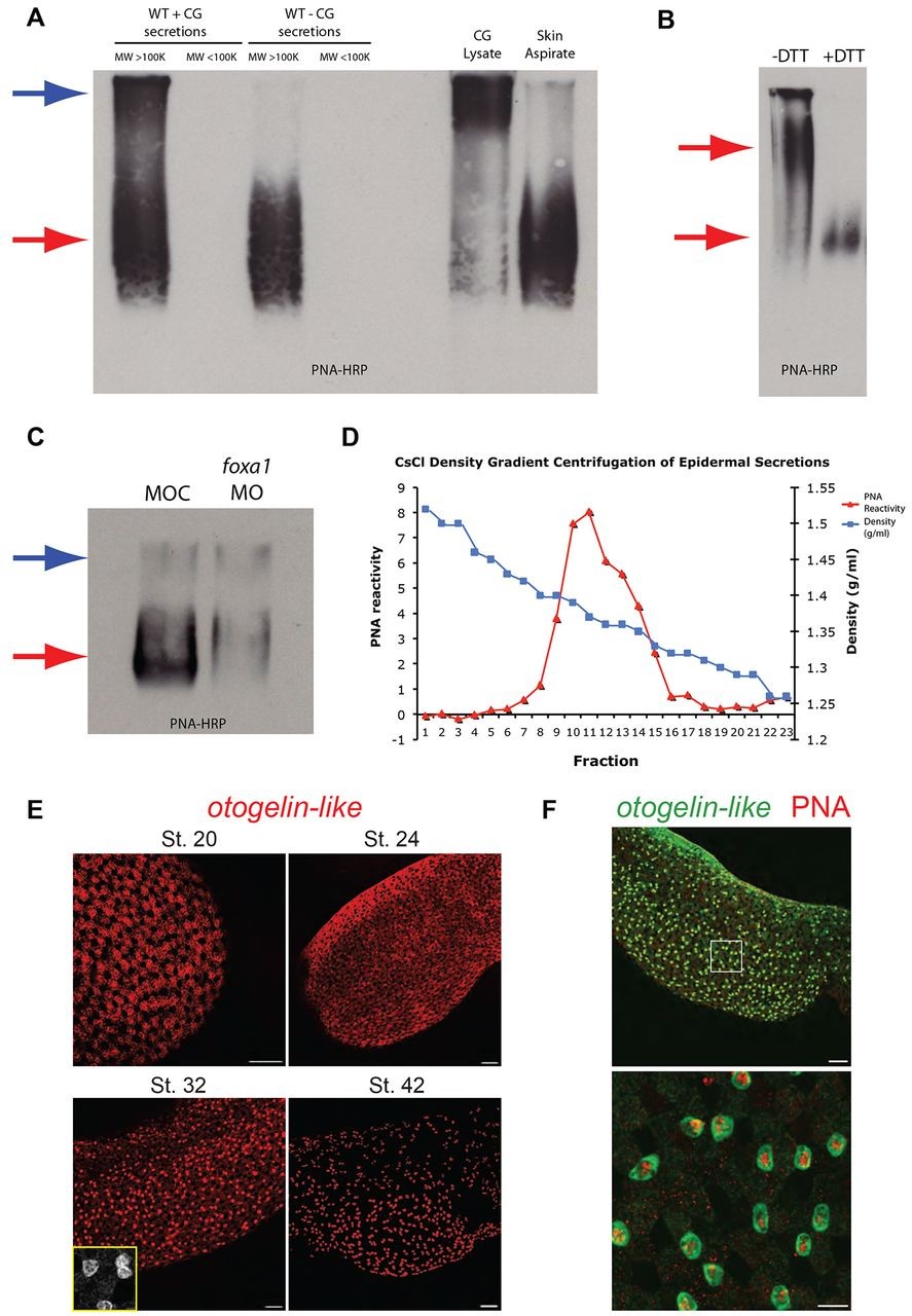 SSCs secrete mucin-like molecule(s). (A) Lectin blot for PNA conjugated to horseradish peroxidase (PNA-HRP) of an agarose gel loaded with samples (reduced and alkylated). Secretions from wild-type embryos with cement gland (WT + CG), put through a filter to remove species with molecular weight lower than 100 kDa, shows two bands positive for PNA (blue and red arrows). For secretions from wild-type embryos with cement gland excised (WT - CG), there is only a single band evident (red arrow). Cement gland lysate alone gave predominantly the upper band, whereas aspirating directly from the skin gave predominantly the lower band. (B) Lectin blot for PNA-HRP of unreduced (-DTT) and reduced (+DTT) samples taken from secretions of wild-type embryos with cement gland removed. Reduced samples migrate much further in the gel. (C) Lectin blot for PNA-HRP comparing levels of PNA positive material secreted into the media in control and foxa1 morpholino-injected embryos. There is a clear reduction in the lower band (red arrow), whereas the upper band (blue arrow) is of a similar level. (D) Chart showing results of CsCl density gradient centrifugation on samples obtained from the media of embryos with cement gland excised. Fractions of decreasing density were harvested and tested for PNA-reactivity in slot blots. Intensity measurements for PNA reactivity were recorded for each fraction and plotted as shown. (E) Timecourse of otogelin-like mRNA in situ hybridisation shows epidermal staining at four stages. There is strong staining in the SSCs at stage 32 (zoom, inset). (F) Otogelin-like (green) in situ hybridisation combined with PNA-Alexa-568 (red) staining, at stage 32, shows colocalisation in SSCs and goblet cells (at a lower level). Lower image is a magnification of the area in the box of the upper image. Scale bars: in E, 100 μm and 10 μm (stage 32 image, inset); in F, 100 μm (upper) and 20 μm (lower).