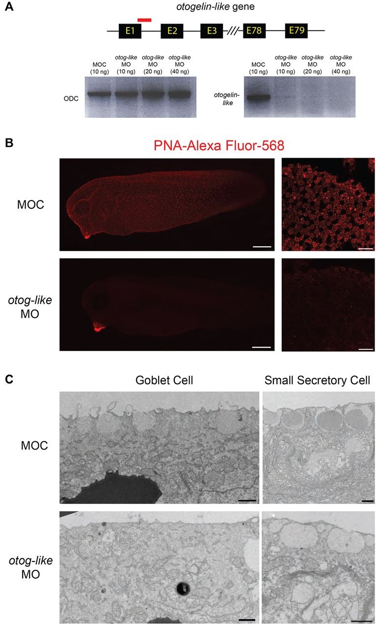 Impact of otogelin-like knockdown on the epidermis. (A) The otogelin-like gene is predicted to have up to 79 exons and 78 introns. An antisense morpholino oligo (red) was designed against the splice junction of exon 1 and intron 1. Loss of otogelin-like transcript is evident with otogelin-like MO compared with controls (MOC) by RT-PCR, indicating knockdown of expression. There is little difference in the intensity of bands for the ubiquitously expressed gene, ornithine decarboxylase (ODC). (B) Comparison of PNA staining in otogelin-like morphants compared with controls (MOC). Right panels are higher magnification images of the flank epidermis. (C) TEM images of goblet cells and SSCs in controls (MOC) and otog-like MO treated embryos. Note absence of dark core in the vesicles of the SSCs. Scale bars: in B, 250 μm (left panels) and 50 μm (right panels); in C, 1 μm.