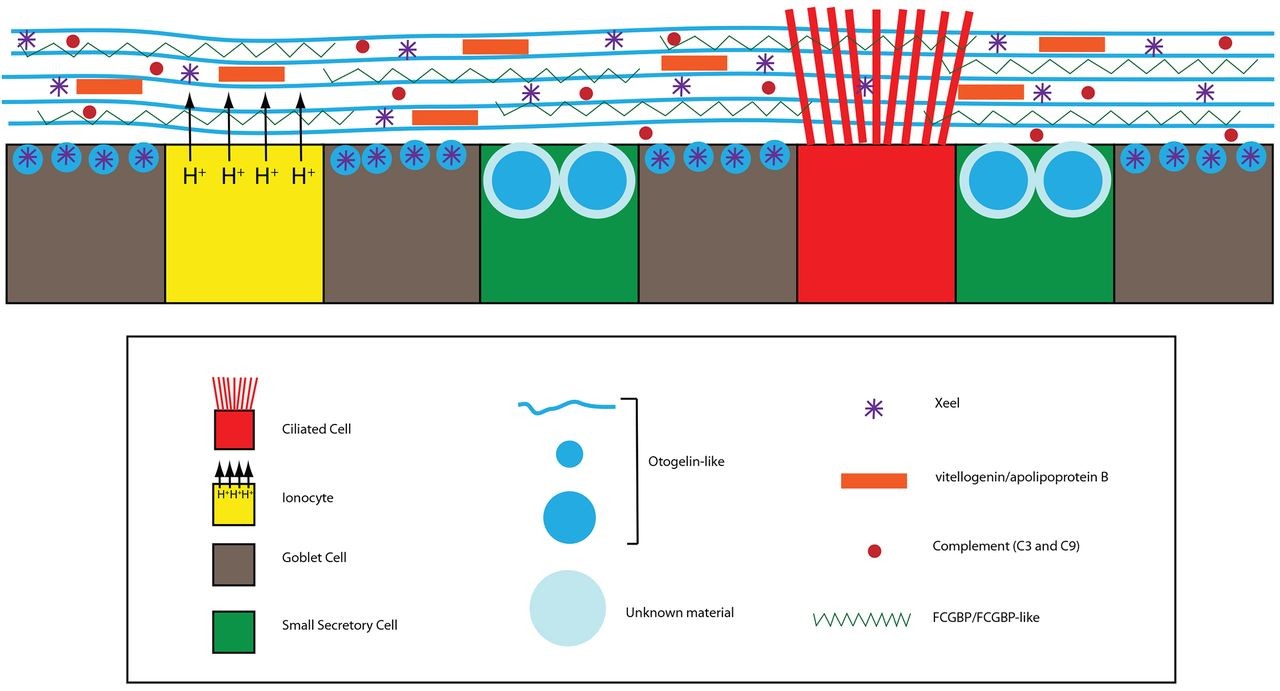 Overview of Xenopus epidermal cell types and secretions. The epidermis of late tailbud/tadpole embryos has four cell types: ciliated cells, ionocytes, goblet cells and small secretory cells. Otogelin-like is a major secretory glycoprotein secreted from goblet cells and SSCs. Goblet cells also secrete the lectin, Xeel. SSCs also secrete another granular material in their vesicles that has yet to be identified. Other innate defence molecules found in secretions include vitellogenin, apolipoprotein b, complement factors (C3 and C9) and FCGBP/FCGBP-like proteins.