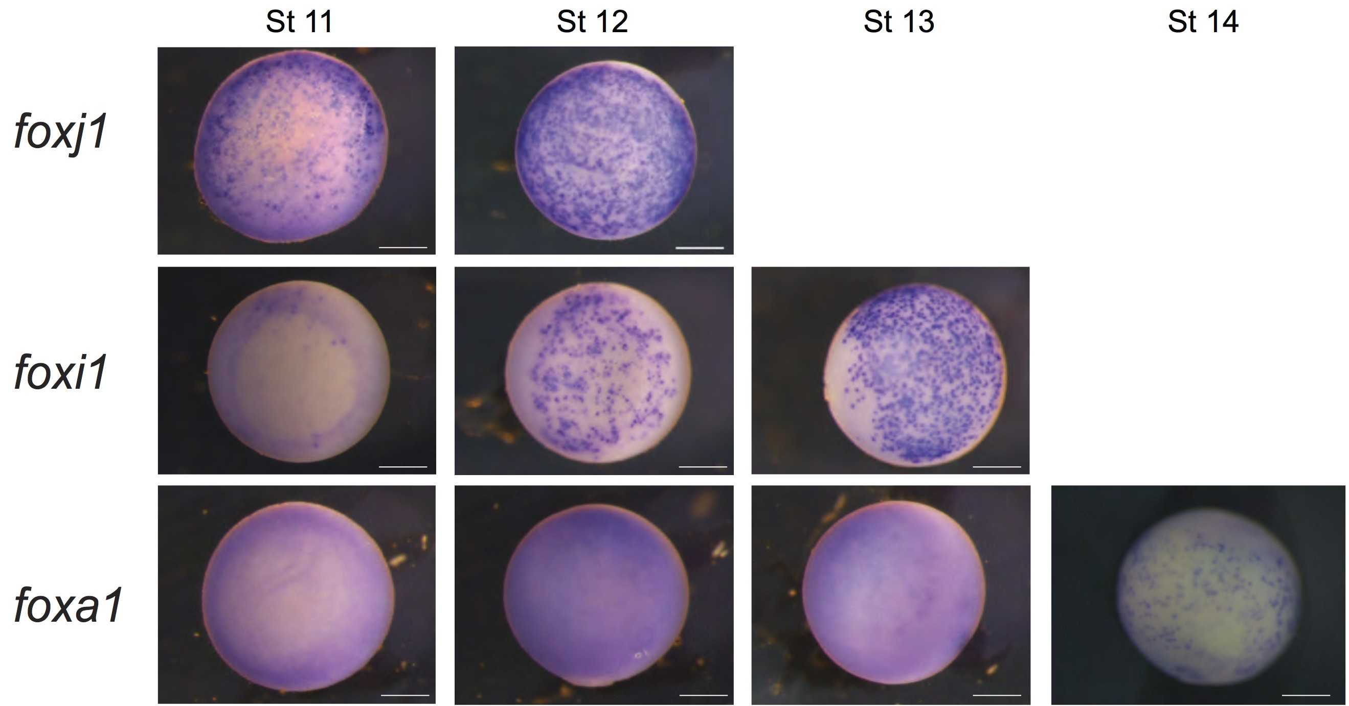 Fig. S1. Time course comparison and expression pattern of new cell type. Time course of expression for early markers of ciliated cells (foxj1), ionocytes (foxi1) and the new cell type (foxa1). Ciliated cells arise first in the epidermis appearing at stage 11, ionocytes next appear at stage 12 and finally the new cell type is expressed in the epidermis in a scattered distribution between stages 13-14. Scale bars: 300 μm.
