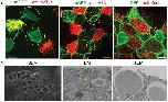 Small cells with large vesicles containing secretory material. (A) Small cells (yellow circles) are not labelled by markers for ciliated cells (anti-AcTub), ionocytes (anti-V1a) or goblet cells (anti-Xeel). Membranes are marked with membrane GFP (mGFP). (B) SEM shows small cells with large apical openings and secretory material highlighted with an arrow. Sections imaged by TEM show vesicles at the apical membrane containing a dark core surrounded by lighter material. Highlighted with a yellow arrow is a vesicle deeper within the cytoplasm that may represent an immature vesicle. Scale bars: in A, 10 μm; in B, 2 μm (SEM), 1 μm (TEM, low magnification) and 0.5 μm (TEM, high magnification).