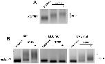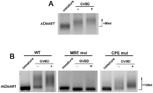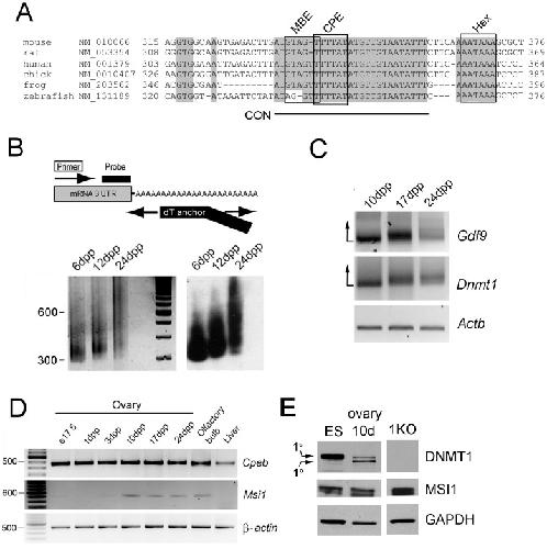 Figure 1. Polyadenylation of Dnmt1 in the mouse ovary.(A) Phylogenetic analysis of the Dnmt1 3â²UTR in Clustal X shows that the CPE and MBE sites form part of a larger conserved element (CON) which is identical across diverse species. Grey shading denotes areas of 100% homology between species. The CPEB binding site (CPE: UUUUAU in mRNA) is boxed by a thick black line; the consensus RNA binding sequence for mammalian Musashi (MBE; G/AU1â3AGU), is present as GTAGT (fine black line). The Hex sequence is also indicated. Species identity and RefSeq accession numbers are indicated at left; Hex- polyA hexanucleotide; CON- conserved region. (B) Rapid Amplification of cDNA End-Poly(A) Test (RACE-PAT) to assess polyadenylation levels. Top panel: Synthesis of cDNA was carried out with oligo dT primer, and subsequent PCR used a Dnmt1 gene-specific primer and anchored oligo dT to prevent artificial shortening of the PCR products in subsequent cycles. Bottom left panel: Endogenous Dnmt1 mRNA undergoes polyadenylation in ovaries where the first wave of oocytes are in the growth phase (6â24 days post partum-dpp). Bottom right panel: Southern blotting and hybridization with the DNMT1-specific probe indicated above. (C) RNA ligation-coupled RT-PCR was used to confirm polyadenylation. Following ligation of an oligo to the poly(A) tails of all mRNA species present in oocytes harvested from ovaries of the indicated age, RT-PCR was carried out using the gene-specific forward primers indicated at right and a primer anti-sense to the ligated oligo. For the Gdf9 positive control, more of the signal is dispersed upwards on the gel (direction of arrow) as mRNA tails become longer in growing oocytes. Dnmt1 mRNA can be seen to follow a similar pattern. Control PCR using gene-specific primers for β-actin demonstrates RNA integrity. (D) RT-PCR shows that transcripts of Cpeb1 are present at high levels in ovaries throughout postnatal development, while Msi1 is expressed in growing oocytes only (10â24 dpp). (E) Western blotting shows that only DNMT1s is found in ES cells, whereas DNMT1o begins to appear in growing oocytes and accumulates by 10 dpp. MSI1 shows strongest expression at 10 dpp. Signal for DNMT1o is visible in 3 month old (3 m) adult ovaries on longer exposure. Knockout ES cells lacking DNMT1 (1KO) and GAPDH are shown as controls.