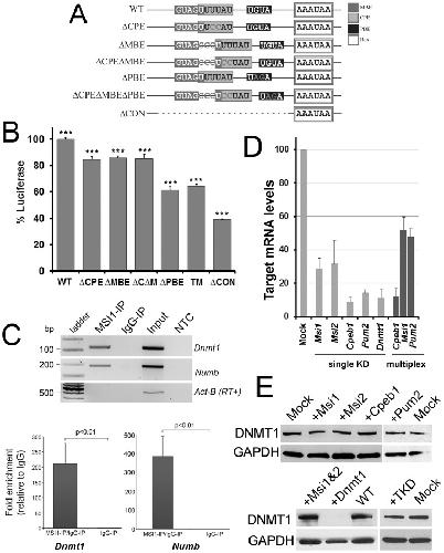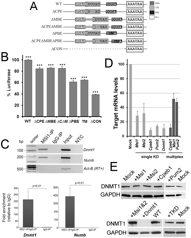 Figure 3. Redundant control involving MSI and CPEin mouse embryonic stem cells.(A) Schematic to show the mutations used to test functional requirements in the Dnmt1 3′UTR after cloning it downstream of a luciferase reporter. As well as the CPE and MBE, the region contains a potential Pumilio binding element (PBE): all three were mutated (dark grey letters) using point mutation or insertions (MBE). The ΔCON construct contains a deletion of the entire conserved block indicated in Fig. 1. (B) Mutations in the CPE (ΔCPE) MBE (ΔMBE), or PBE significantly decrease translation of the luciferase reporter in mouse ES cells, but combined mutations (ΔCΔM; or triple mutant, TM) do not have an additive effect. Deletion of the conserved region reduces translation to below 40% of the wildtype Dnmt1 3′UTR. Readings in triplicate from more than three independent experiments are presented as mean +/−SEM; ***p<0.001 (by 2-tailed unpaired Students T-test) compared to expression of wildtype, which was arbitrarily set to 100%. (C) MSI1 interacts with endogenous Dnmt1 mRNA. RNA-immunoprecipitation was performed in R63 mouse ES cells with anti-MSI1 antibody or normal rabbit IgG. Immunoprecipitated RNA was analysed by RT-PCR (top panel). The known MSI1 target Numb could be amplified, while Actb which is not a target, was absent, confirming the technique was working. Dnmt1 could be amplified from MSI1 immunoprecipitates, but not negative controls, indicating MSI1 also binds to this mRNA. A no template control (NTC) was also included. Quantification by RT-qPCR (bottom panel) indicated significant enrichment of Dnmt1, to levels approx. half that of Numb (bottom right). Results are the average of three independent experiments carried out in triplicate. (D) Transient knockdown of RNA binding proteins in ESC. Levels of depletion of the respective target mRNAs following transfection by the indicated siRNA were assessed by RT-qPCR. A scrambled siRNA (mock) was used as a control. An example multiplex experiment (dark bars) is shown at right. All target mRNA were significantly reduced (p<0.05) in single or multiplex experiments. (E) Western blotting showing redundant control ensures DNMT1 translation in ESC. Transient depletion of any one of the RNA binding proteins MSI1, MSI2, CPEB or PUM2, or of combinations thereof such as MSI1 and MSI (MSi1&2) and MSI1, CPEB1 and PUM2 (TKD), had no detectable effect on DNMT1 protein levels in ESC. DNMT1 siRNA are shown as a positive control, mock and WT are negative controls.