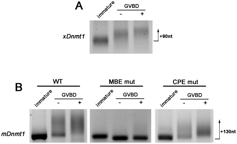 Figure 2. Msi plays a key role in polyadenylation in the Xenopus oocyte.(A) Polyadenylation occurs at GVBD in Xenopus oocytes. RNA ligation-coupled RT-PCR indicates that the endogenous Xenopus Dnmt1 mRNA (xDnmt1) has a short poly(A) tail in immature oocytes, but becomes elongated during progesterone stimulated maturation (arrow indicates extent of polyadenylation). Oocytes were collected when 50% had undergone germinal vesicle breakdown (GVBD) and grouped into those which had (+) or had not (−) completed GVBD. The maximum size of poly(A) tail confirmed by sequencing is indicated in nucleotides (nt) beside the arrow. (B) Polyadenylation of mouse Dnmt1 (mDnmt1) in Xenopus oocytes requires the MBE but not CPE. In vitro transcribed wildtype (WT), MBE mutant (MBE mut), or CPE mutant (CPE mut) Dnmt1 3′UTR constructs were injected into immature Xenopus oocytes, which were then stimulated with progesterone treatment and assayed as above. When the MBE is mutated, polyadenylation does not occur, while the pattern of polyadenylation of the CPE mutant is similar to wildtype. Max confirmed poly(A) tail size by cloning indicated as for (A).