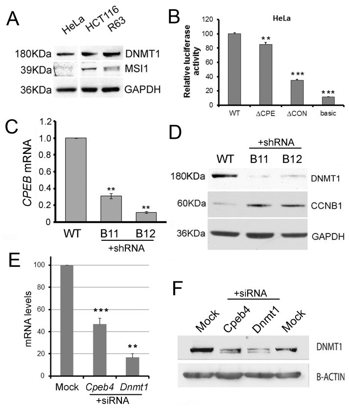 Figure 4. Cells lacking MSI1 show greater CPEB dependence.(A) HeLa cells lack MSI1. Western blotting shows that while DNMT1 is expressed in HeLa, HCT116 and R63 ES cells, the expression of MSI1 is limited and detected only in HCT116 and R63 ES cells. Sizes are indicated in kilodaltons (kDa). Similar results were found for PUM2 (B) CPE is one important component of translational control in HeLa. Luciferase constructs as indicated in Fig. 3 were transfected into HeLa cells. Mutation of the CPE reduced expression of the reporter gene to a similar extent as observed in ESC cells. Significance **p<0.01; ***p<0.001 (C) CPEB1 was targeted for knockdown in HeLa cells by stable shRNA expression. Levels of CPEB1 mRNA in two clonally-derived cell lines B11 and B12 carrying the shRNA are shown. (D) Dnmt1 mRNA levels remain stable in CPEB1 knockdown cell lines. (E) Stable CPEB1 knockdown prevents efficient DNMT1 translation. Protein levels of CCNB1, which is known to be translationally repressed by CPEB1, show upregulation in both stable knockdown cell lines as expected. Reprobing the same membrane shows DNMT1 protein levels are reduced in these samples. Molecular weights are indicated to the left in kiloDaltons (KDa). (F) CPEB4 transient knockdown in HeLa. RT-qPCR shows mRNA levels relative to mock-transfected cells following transient knockdown of CPEB4 and DNMT1 in HeLa. (G) Transient depletion of CPEB4 reduces DNMT1 protein levels to an extent comparable to that achieved by DNMT1 siRNA.