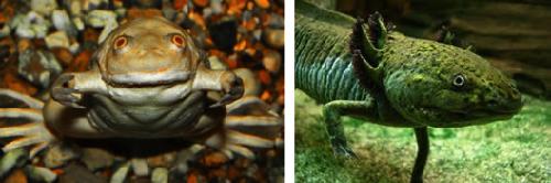 Xenopus laevis (African clawed frog) and Ambystoma mexicanum (Axolotl, or Mexican salamander) are common laboratory model amphibians with unusual appearance. A post-metamorphic xenopus is shown on the left and neotenic adult wild type axolotl shown right. Xenopus image courtesy of LHG creative Photography Under licence CC BY-NC-ND 2.0.