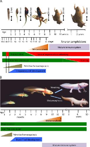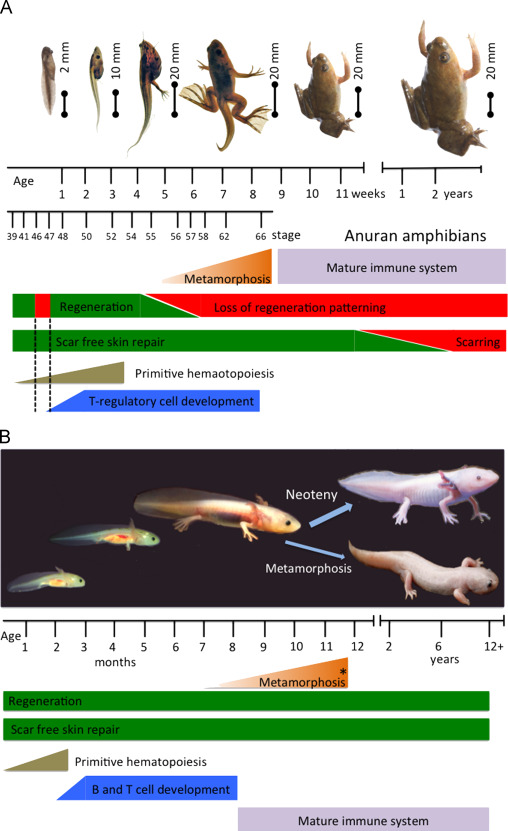 Scar-free healing and regeneration is inversely correlated with development in anuran amphibians but is maintained in adult life in urodeles. (A) The development of sophisticated adult adaptive immunity begins at the onset of frog metamorphosis and is associated with a progressive loss of patterned regeneration where the number of digits that can be regenerated gradually declines between stage 55 to stage 60. While amputation at stage 53 results in a perfectly patterned limb, at stage 60 regeneration results in a “non-patterned spike”. Tail regeneration is transiently lost during a “refractory period” (stage 45–47, marked with dotted line), which coincides with early immune cell development in the absence of regulatory T cells (T-regs). Restoration of functional regenerative potential in the tail is correlated with T-reg cell development. Scar-free wound healing is lost in adult anuran amphibians. (B) Scar free wound healing and regeneration is maintained throughout all life stages in salamanders. Metamorphosis is linked to relatively minor changes in adaptive immunity and regenerative capacity is maintained. Most salamander species transition through metamorphosis; however some species like the axolotl may have neotenic life cycles that do not normally transition through metamorphosis but can be chemically induced to do so. Unlike frogs, scar-free healing is maintained in adult life in salamanders. Various axolotl natural pigment mutants are available. (Common laboratory “white mutant” shown). Xenopus images courtesy of David Bay and the National Science Foundation.