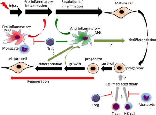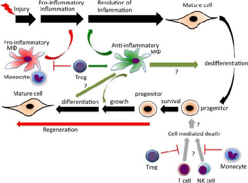 Hypothetical model for monocyte/macrophage (MΦ) regulation of progenitor cell activation, survival, growth and differentiation in the salamander. Within the influx of various white blood cells types that invade the damaged tissue monocyte/macrophage cell types are critical for regenerative success. Monocyte/macrophage populations regulate the resolution of inflammation, provide growth factors and signaling molecules important for angiogenesis and may influence the differentiation of progenitor cells. Monocyte/macrophage populations may also play a role in facilitating dedifferentiation and the regulation of cell mediated lysis.