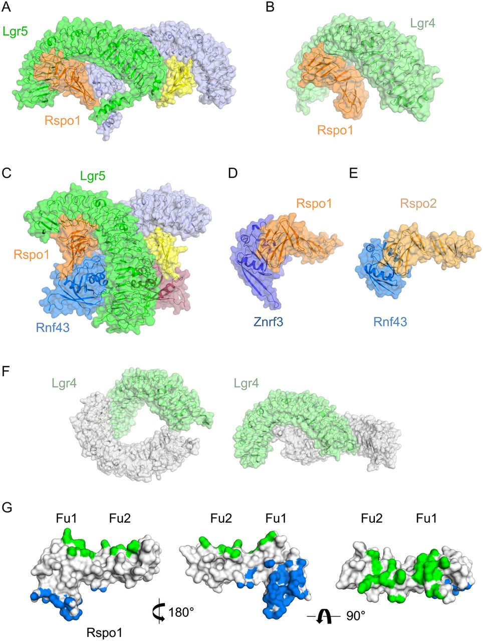 Figure 4. Crystal structures of the Lgr4/5, Rspo1/2, and Znrf3/Rnf43 complexes. (AâF) Crystal structures of various complexes in cartoon and surface representation. (A) Lgr5âRspo1 (Protein Data Bank [PDB] 4BSR) (Peng et al. 2013a). (B) Lgr4âRspo1 (PDB 4KT1) (Wang et al. 2013a). (C) Lgr5âRspo1âRnf43 (PDB 4KNG) (Chen et al. 2013). (D) Znrf3âRspo1 (PDB 4CDK) (Peng et al. 2013b). (E) Rnf43âRspo2 (PDB 4C9V) (Zebisch et al. 2013). (F) Lgr4 (PDB 4LI1) (Xu et al. 2013). (G) Overview of the binding interfaces of Lgr5âRspo1 and Rnf43âRspo1, based on the crystal structure of Lgr5âRspo1âRnf43 (PDB 4KNG) (Chen et al. 2013). Shown are the contact footprints of Lgr5 on Rspo1 (in green) and Rnf43 on Rspo1 (in blue) in orthogonal views. |