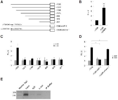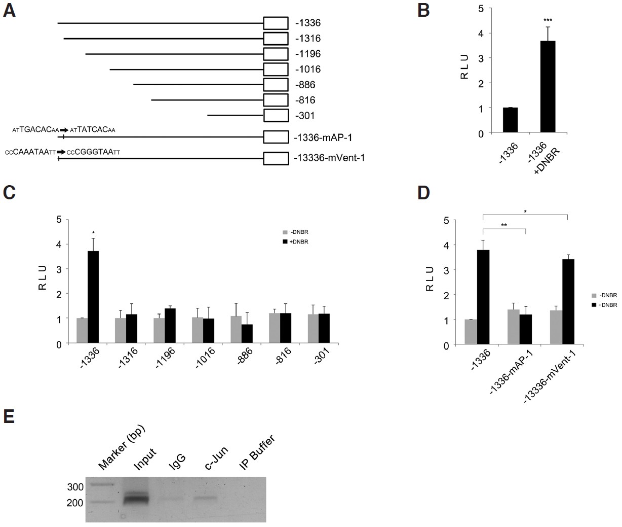 Fig.2. The AP-1 binding site has a critical role in dominant-negative BMP receptor (DNBR)-induced FoxD5b expression. (A) Schematic representation of FoxD5b serially truncated constructs and a point mutation of AP-1 and Vent-1 putative binding site constructs (B). Embryos were co-injected with the -1336 construct (20pg) and DNBR (1ng) at the one-cell stage and incubated until stage 10. Luciferase activity was measured as described in Methods. (C) Various truncated constructs (20pg) were either injected alone or co-injected with DNBR (1ng) at the one-cell stage. Animal cap explants were dissected at stage 8, incubated until stage 10 and then luciferase activity was measured. (D) The -1336, AP-1 or Vent-1 site mutants were either injected alone or co-injected with DNBR (1ng) at the one-cell stage. Animal caps were dissected at stage 8, and their luciferase activity was measured at stage 10. (E) A chromatin immunoprecipitation (ChIP) assay was performed using Xenopus embryos at stage 10. The presence of the FoxD5b promoter was detected by PCR in DNA samples obtained from anti-c-Jun antibody precipitation (c-Jun), normal IgG antibody precipitation (IgG), and cross-linked chromatin supernatant before immunoprecipitation (Input). RLU, relative luciferase activity. *, p value < 0.05, **, p value < 0.01; ***, p value < 0.001.