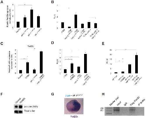 Fig. 4. An AP-1 complex composed of c-Jun and FosB induced FoxD5b expression. (A) AP-1 RNA (1ng), as indicated, was injected at the one-cell stage. Animal cap explants were dissected at stage 8 and incubated until stage 10. RT-PCR was performed for the analysis of FoxD5b expression. (B) The -1336 or -1336-mAP-1 construct was co-injected with AP-1c-Jun/FosB or DEPC-Q as indicated at the one-cell stage. Animal cap explants were dissected at stage 8, and their luciferase activity was measured at stage 10. (C) DNBR (0.5ng) and AP-1c-Jun/FosB (0.5ng) were co-injected at the one-cell stage as indicated. Animal cap explants were dissected at stage 8 and incubated until stage 10. RT-PCR was performed for the analysis of FoxD5b expression. (D) The -1336 construct was co-injected with DNBR (0.5ng) or AP-1c-Jun/FosB (0.5ng) as indicated at the one-cell stage. Animal cap explants were dissected at stage 8, and their luciferase activity was measured at stage 10. (E) AP-1 luc was co-injected with DNBR (2ng) or AP-1c-Jun/FosB (125pg) as indicated at the one-cell stage. Animal cap explants were dissected at stage 8, and their luciferase activity was measured at stage 10. (F) DNBR RNA (1ng) was injected into the animal pole region at the one-cell stage. Animal caps were dissected at stage 8 and incubated until stage 10. The western-blot assay was performed with specific anti-phospho c-Jun antibodies (#9261, Cell signaling, MA). (G) AP-1c-Jun/FosB mRNAs (1ng) were injected into the one blastomere at the 2 cell stage. Embryos were processed for whole mount in situ hybridization with anti-sense probe of FoxD5b at stage 10. (H) A chromatin immunoprecipitation (ChIP) assay was performed using Xenopus embryos at stage 10. The presence of the FoxD5b promoter was detected by PCR in DNA samples obtained from anti-Flag antibody precipitation (Flag), normal IgG antibody precipitation (IgG), and cross-linked chromatin supernatant before immunoprecipitation (Input). RLU, relative luciferase activity. *, p value < 0.05, **, p value < 0.01; ***, p value < 0.001.