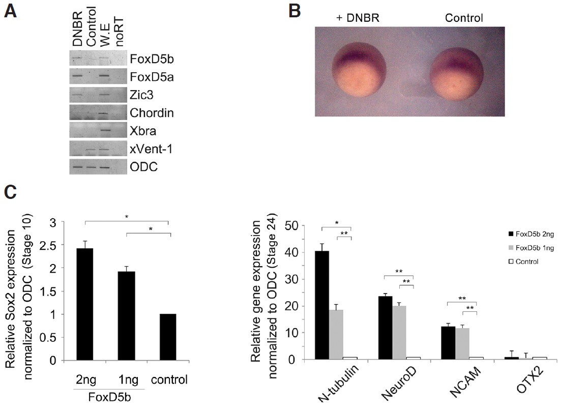 Fig. 1. FoxD5b is induced by dominant-negative BMP receptor (DNBR) and promotes neurogenesis in animal cap explants. (A) DNBR RNA (1ng) was injected into the animal pole region at the one-cell stage. Animal caps were dissected at stage 8 and incubated until stage 10. RT-PCR was performed for the analysis of the expression of the indicated genes. (B) Embryos injected with DNBR mRNAs (1ng) were processed for whole mount in situ hybridization with anti-sense probe of FoxD5b at stage 11. (C) FoxD5b RNA (2 or 1 ng) was injected into the animal pole region at the one-cell stage. The animal caps were dissected at stage 8 and incubated until stage 10 or 24. qRT-PCR was performed for the analysis of the expression the indicated genes. *, p value < 0.05, **, p value < 0.01.